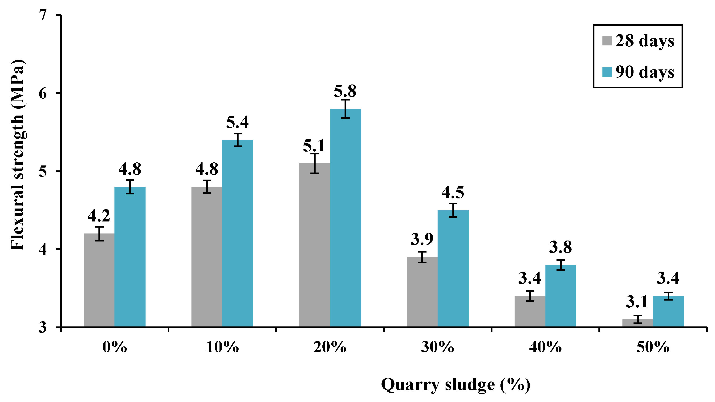 The flexural strength results of the various concrete mix designs incorporating different proportions of SQS as a partial replacement for sand are presented in