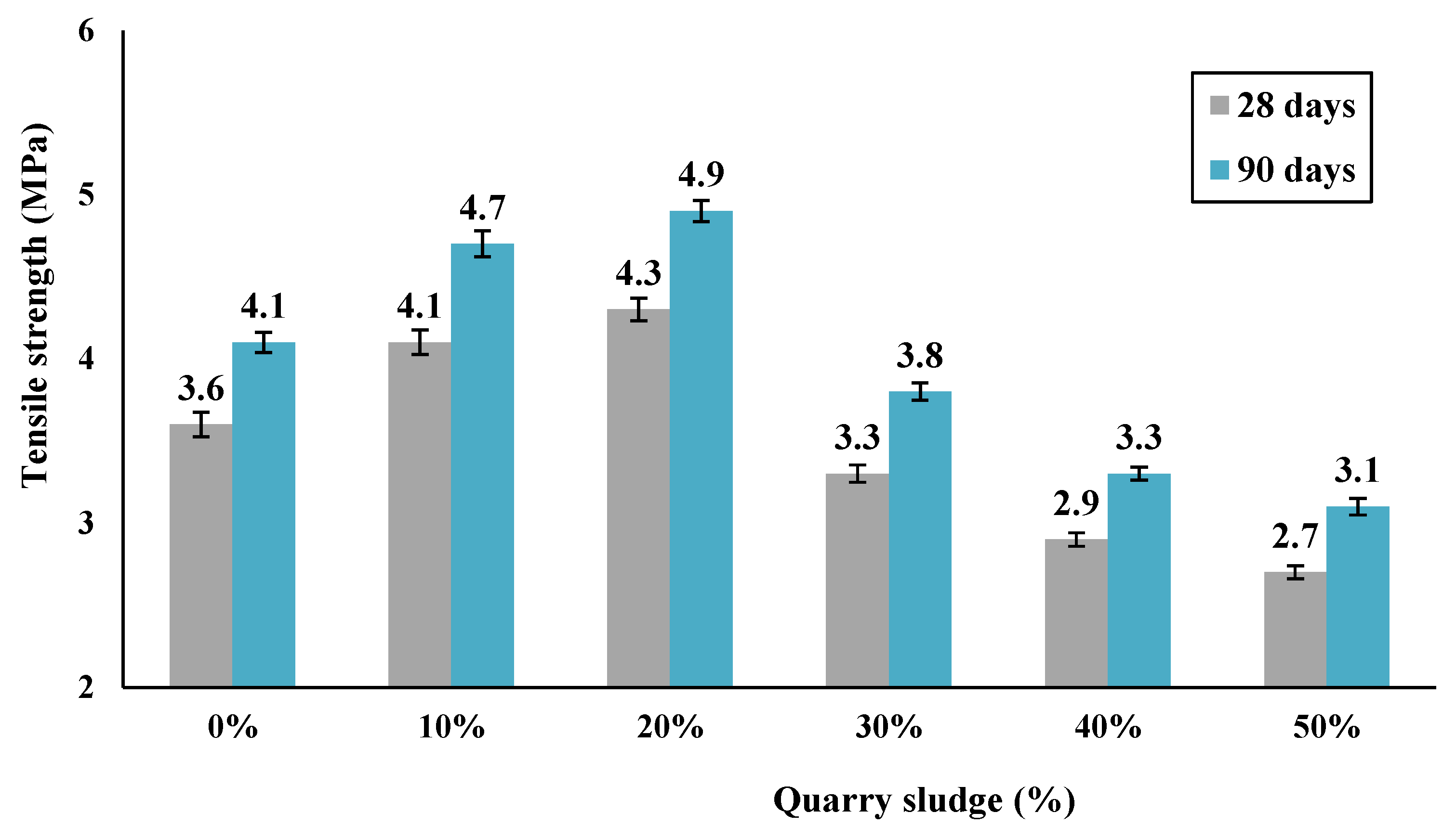 Figure 6, revealing a distinct trend in response to varying replacement levels of stone quarry sludge (SQS) with fine aggregates. Specifically, tensile strength increases noticeably as the SQS replacement level rises from 0% to 20%. This enhancement can be attributed to several synergistic mechanisms. First, the fine particle size and angular morphology of SQS contribute to improved interfacial bonding between the cement paste and aggregate particles, thereby enhancing matrix cohesion. Second, the partial substitution introduces additional nucleation sites that may accelerate the formation of hydration products, particularly calcium silicate hydrate (C–S–H) gel, which plays a critical role in tensile load transfer. Third, the pozzolanic reactivity of SQS may consume calcium hydroxide and generate secondary C–S–H, further densifying the microstructure and reducing microcrack propagation under tensile stress.