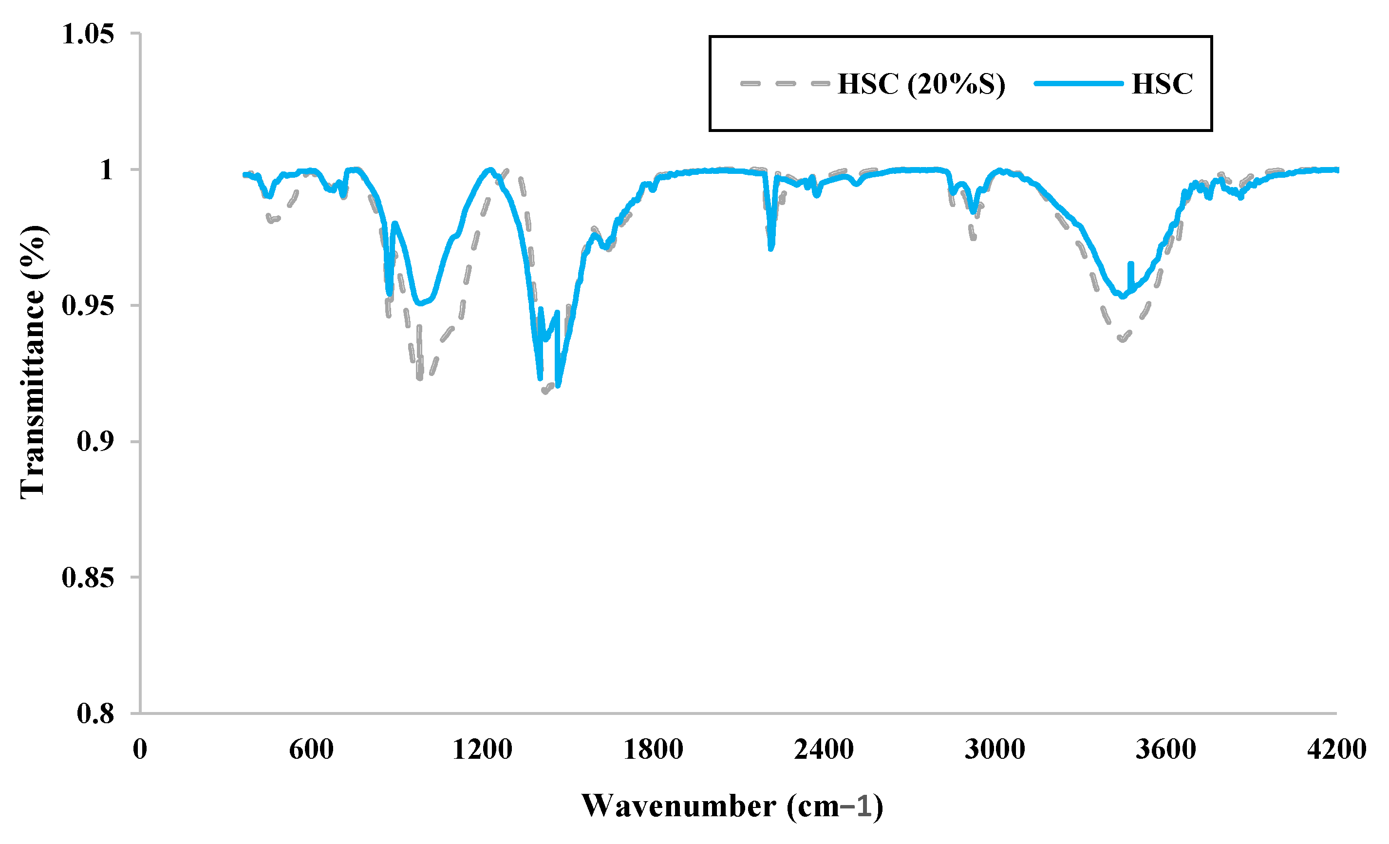 −1, which corresponds to the asymmetric stretching vibrations of Si–O bonds in calcium silicate hydrate (C–S–H) gel—a primary hydration product responsible for strength development in cementitious systems. The HSC (20% SQS) sample exhibits a notably higher peak intensity in this region compared to the control mix, indicating a greater concentration of C–S–H phases.