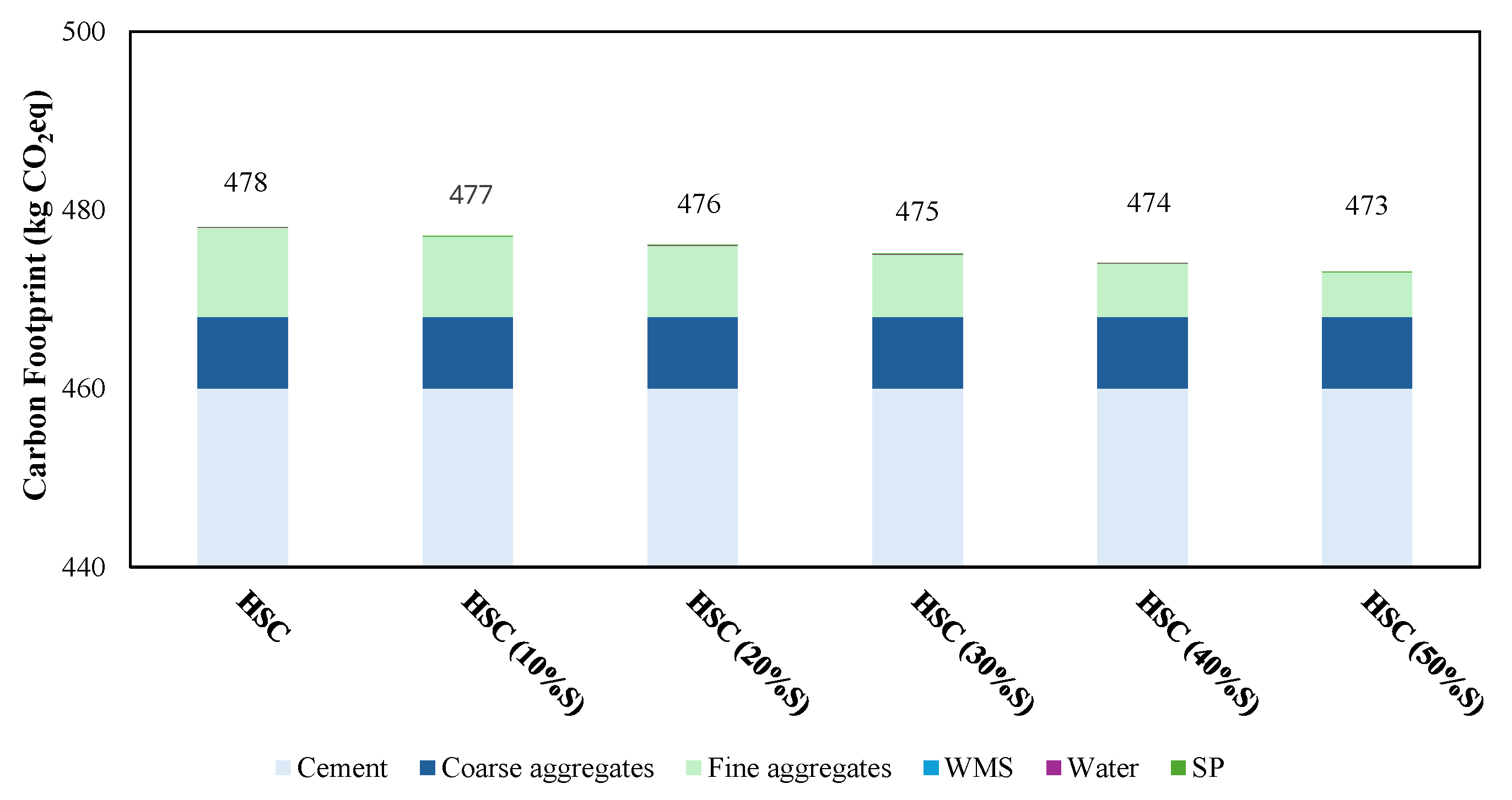 Figure 9. The calculated results reveal a clear declining trend in the total embodied carbon with increasing SQS content. The control mix (HSC without sludge) exhibited the highest footprint at approximately 478 kg CO