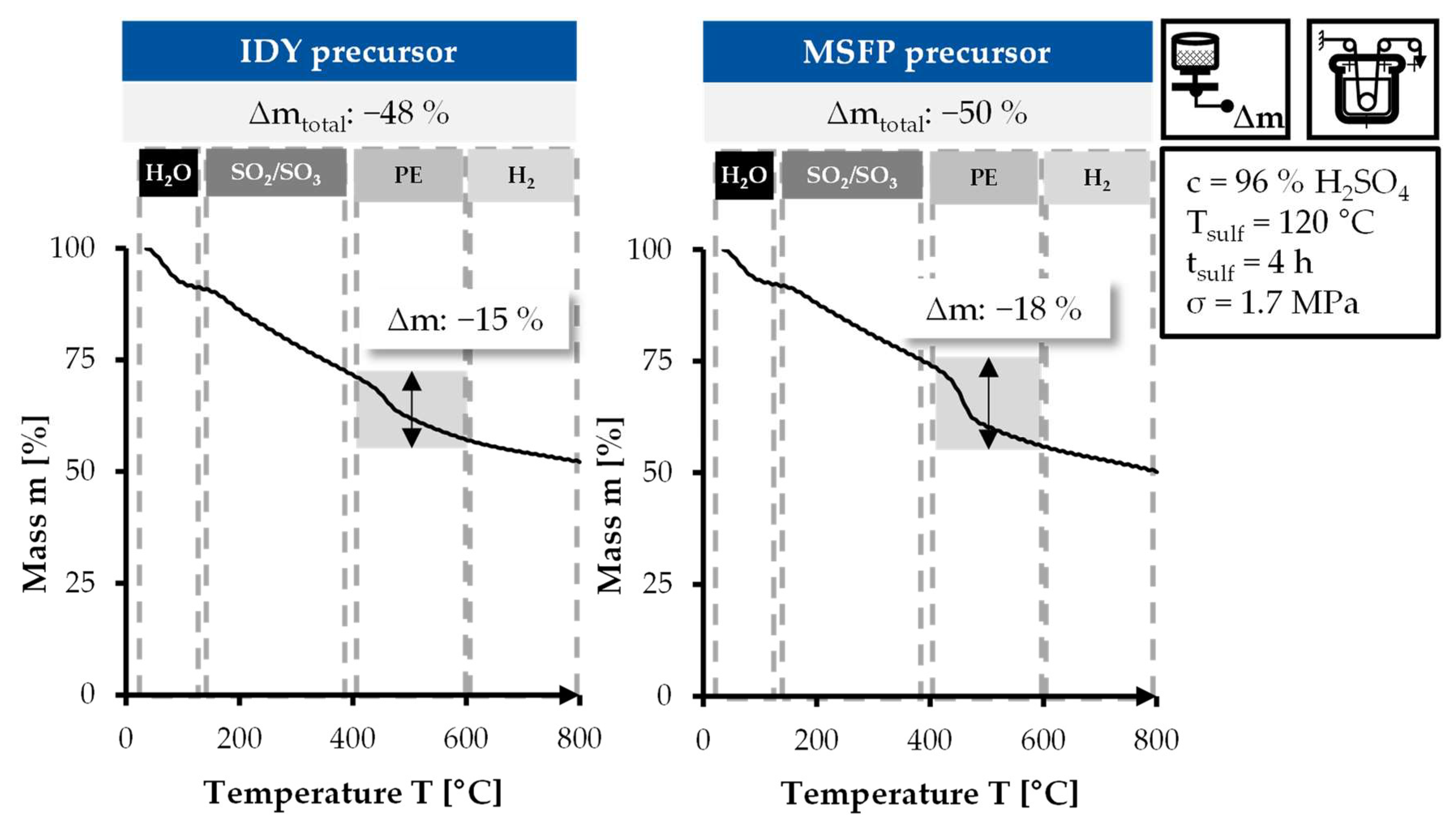 Figure 9 show the dependency of the sample mass loss from the temperature. In the case of the sulfonated IDY precursor, there is a total mass loss of 48%, and a lower 15% mass loss in the relevant 400–600 °C region. Importantly, a steep drop in the TGA curve in that temperature region is mostly avoided. When comparing the TGA curves of both sulfonated precursors, the IDY precursor achieves a higher sulfonation and cross-linking degree, which is one of the main factors for establishing suitability of PE precursors for carbon fibre production. In the case of the sulfonated MSFP precursor, there is a total mass loss of 50%, an 18% mass loss in the critical range of 400–600 °C, which is accompanied by a significant steep drop in the TGA curve in that region. This indicates insufficient sulfonation and cross-linking degree, which can lead to hollow or porous carbon fibres after carbonisation.
