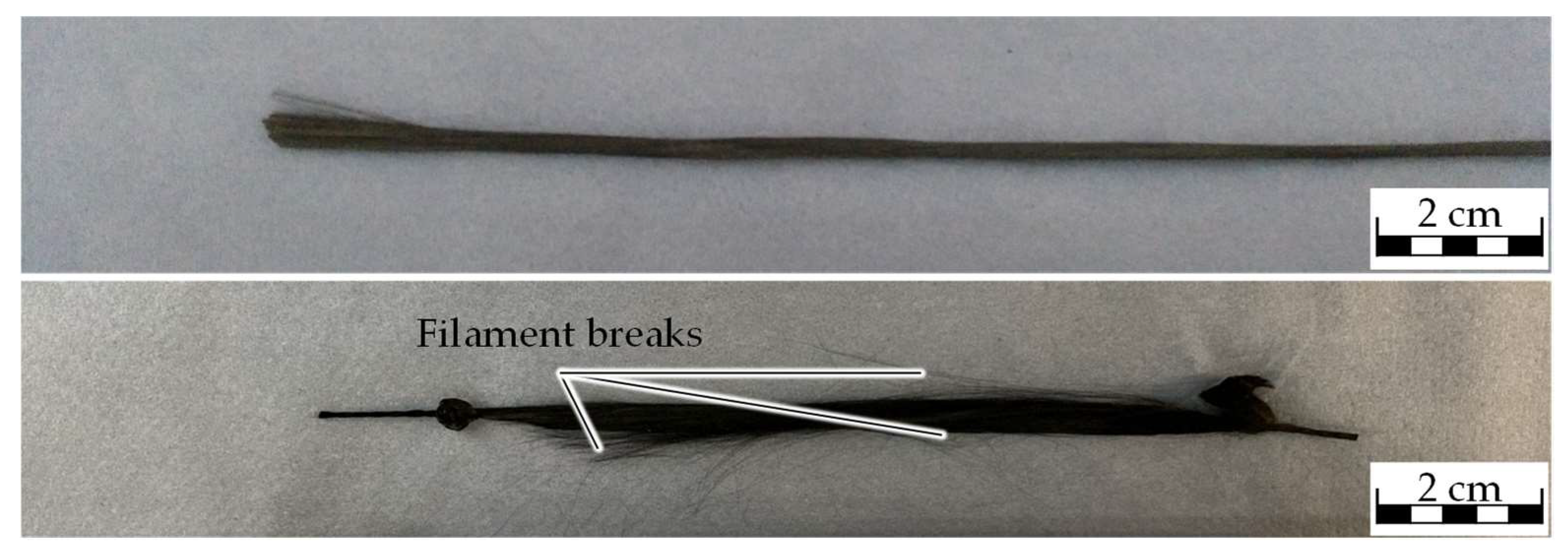 8]. By contrast, the MSFP 10 k precursor (18.1 ± 2.0 µm; 21.9 ± 3.8 cN/tex; 130.8 ± 40.8% elongation) did not meet convertibility requirements and produced brittle CF with filament breaks after discontinuous carbonisation.