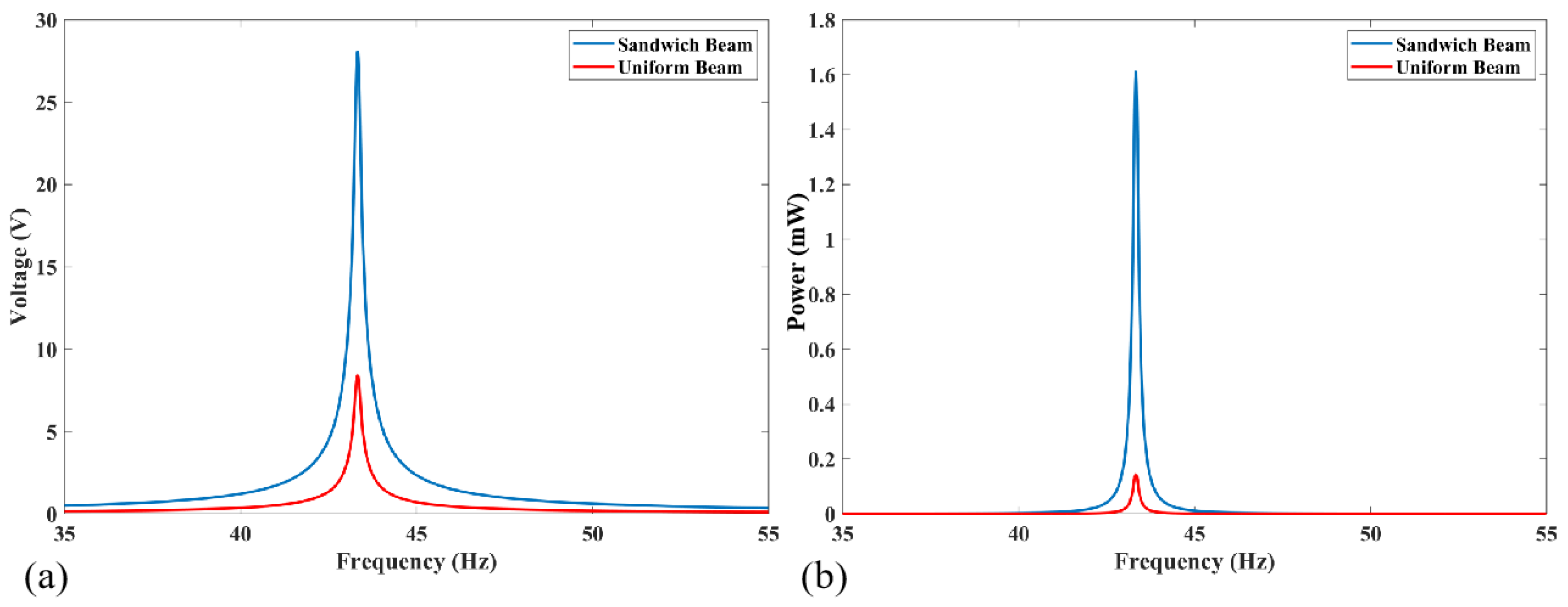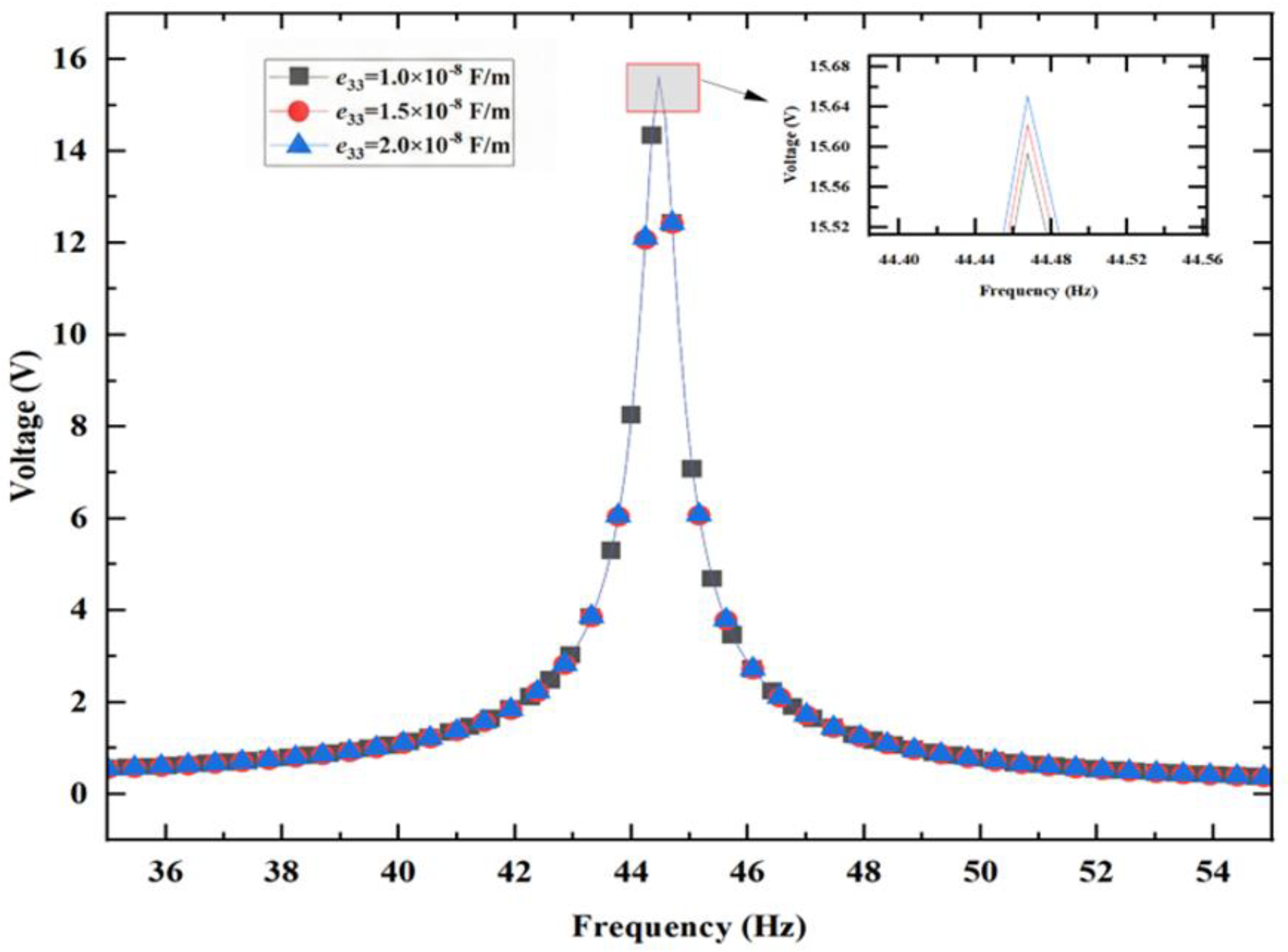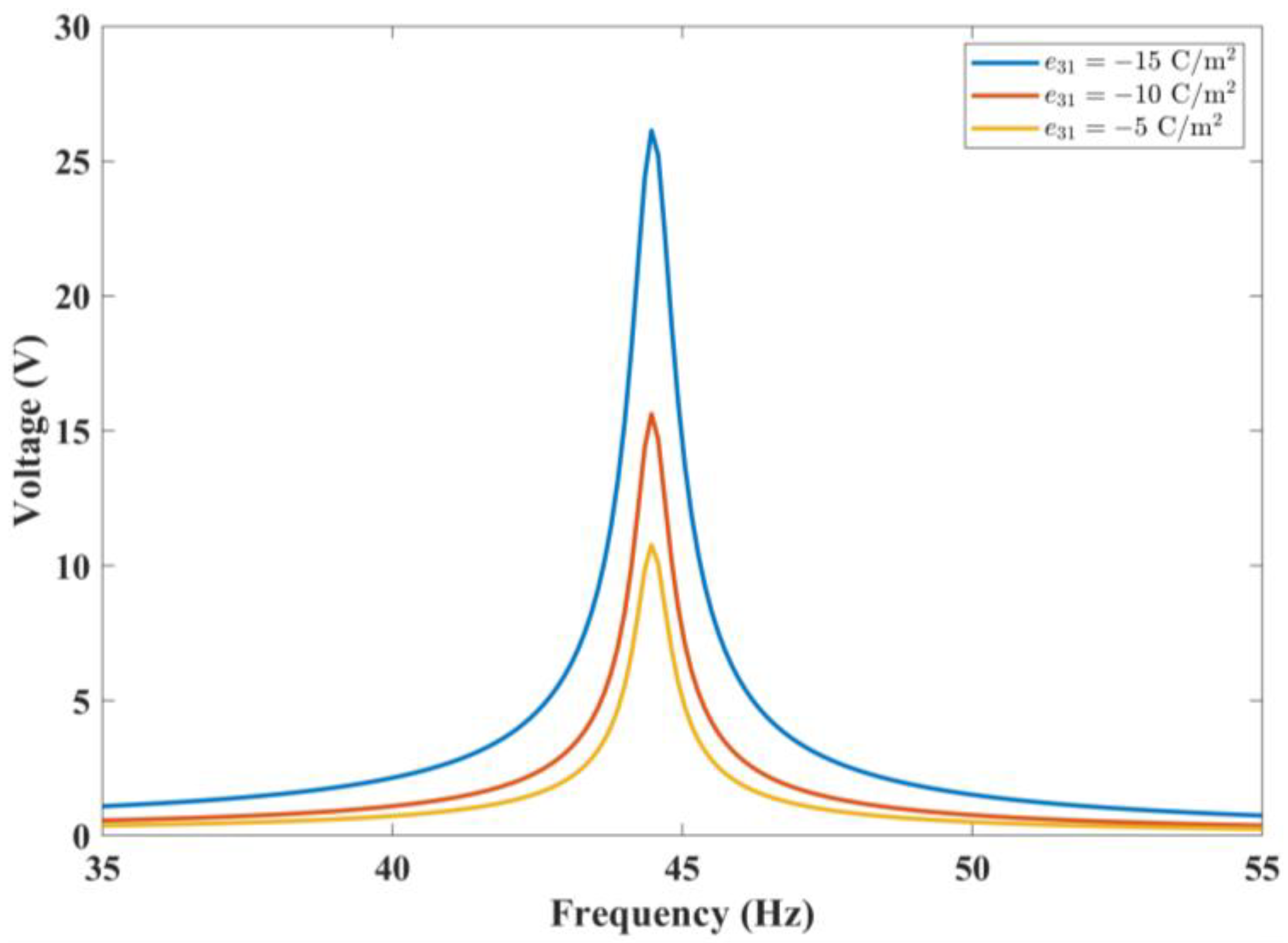 e31 on voltage output may stem from the dominance of structural parameters (core shear modulus and elastic support stiffness in determining the overall strain distribution under the applied excitation. For the low-amplitude, linear vibration regime considered here, the electromechanical coupling terms appear to saturate or be constrained by the fixed mechanical input and internal capacitance, resulting in a response to changes in