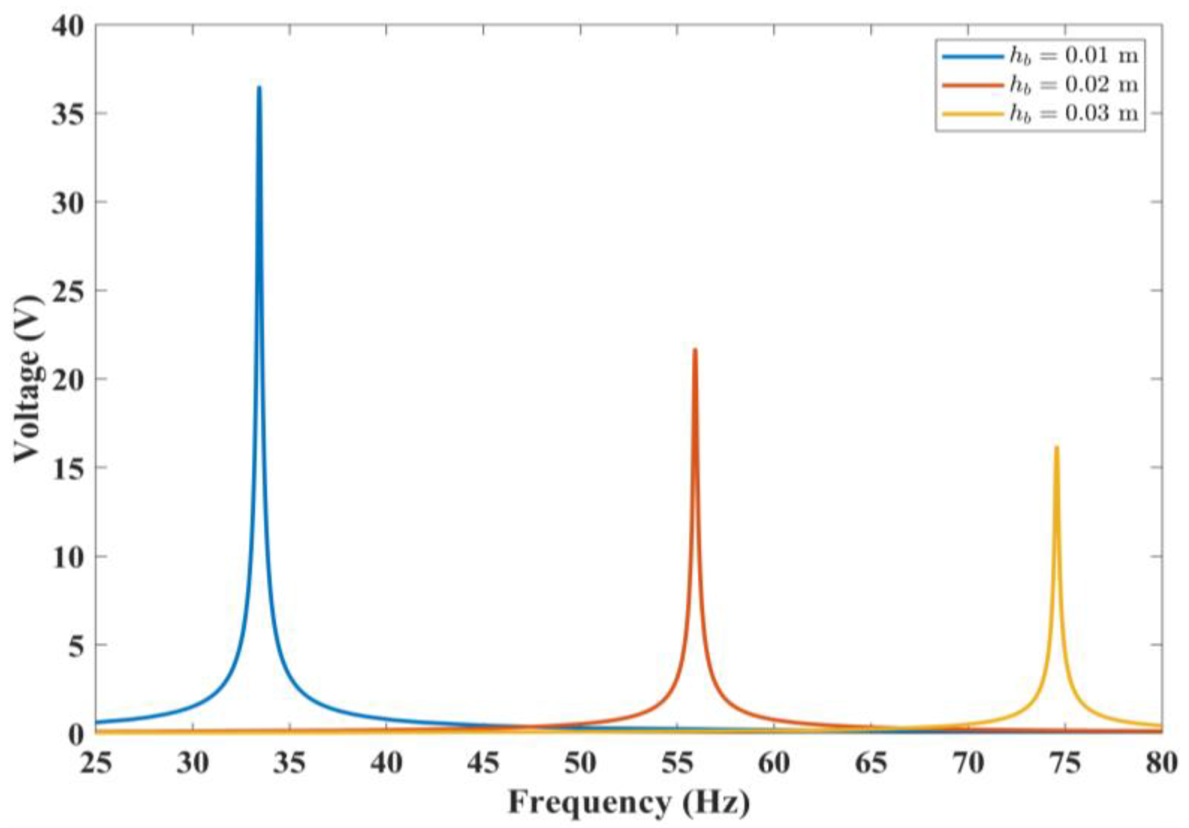 hb and restricts flexural modes essential for piezoelectric strain generation. Concurrently, voltage output diminishes due to reduced transverse deformation under fixed excitation, as the stiffer core limits strain in the piezoelectric layer. Practically, this suggests optimal