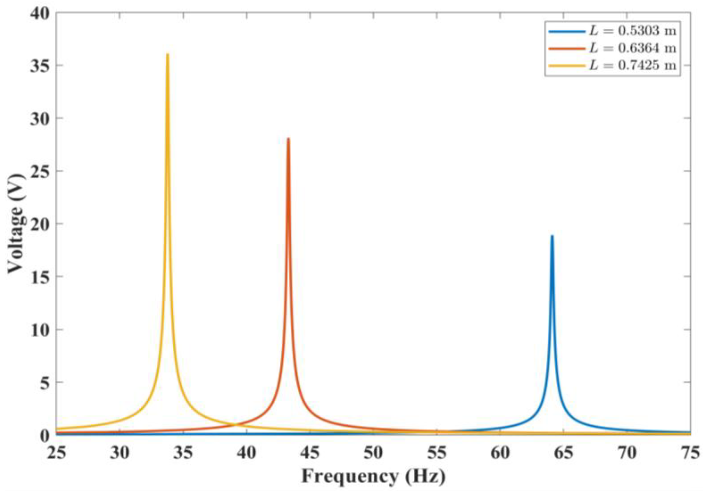 L amplifies the mass matrix while diluting bending stiffness per unit length, fostering lower-frequency modes more susceptible to Rayleigh damping. The enhanced voltage peaks arise from greater overall deformation and strain accumulation across the extended structure, allowing for amplified piezoelectric conversion despite the frequency shift.