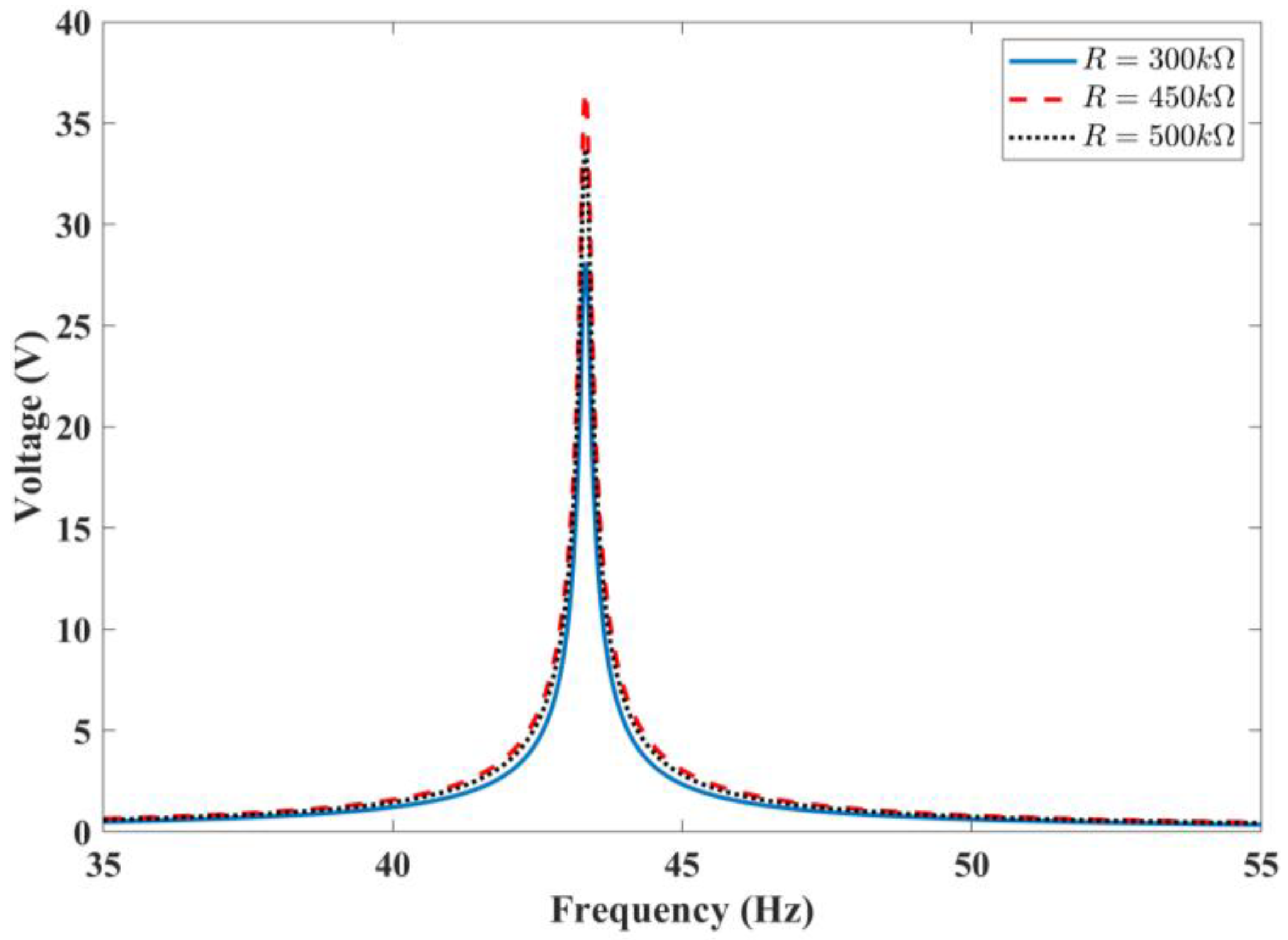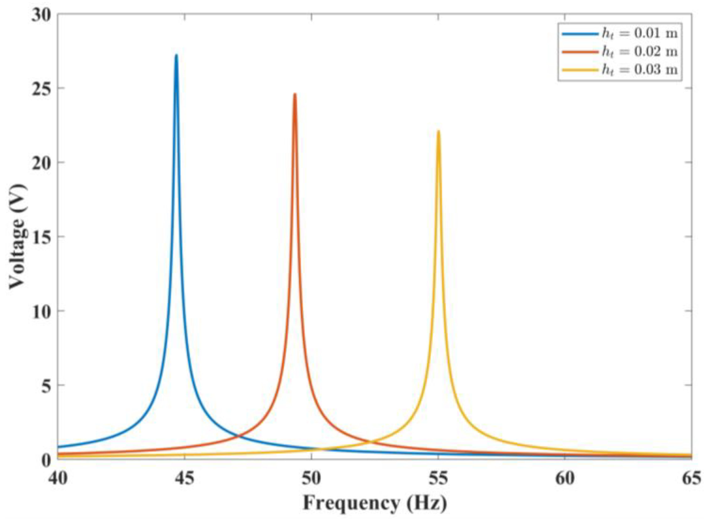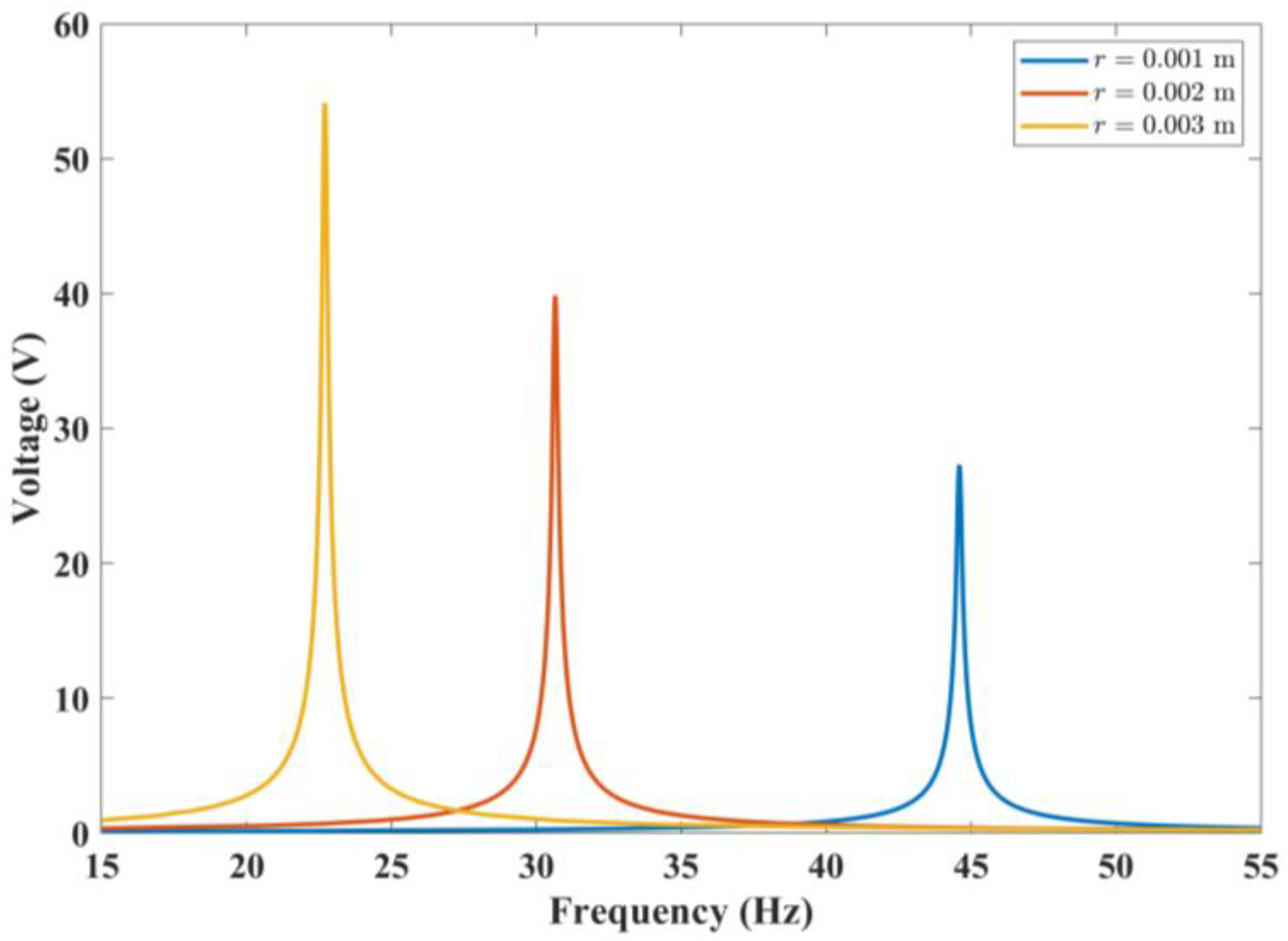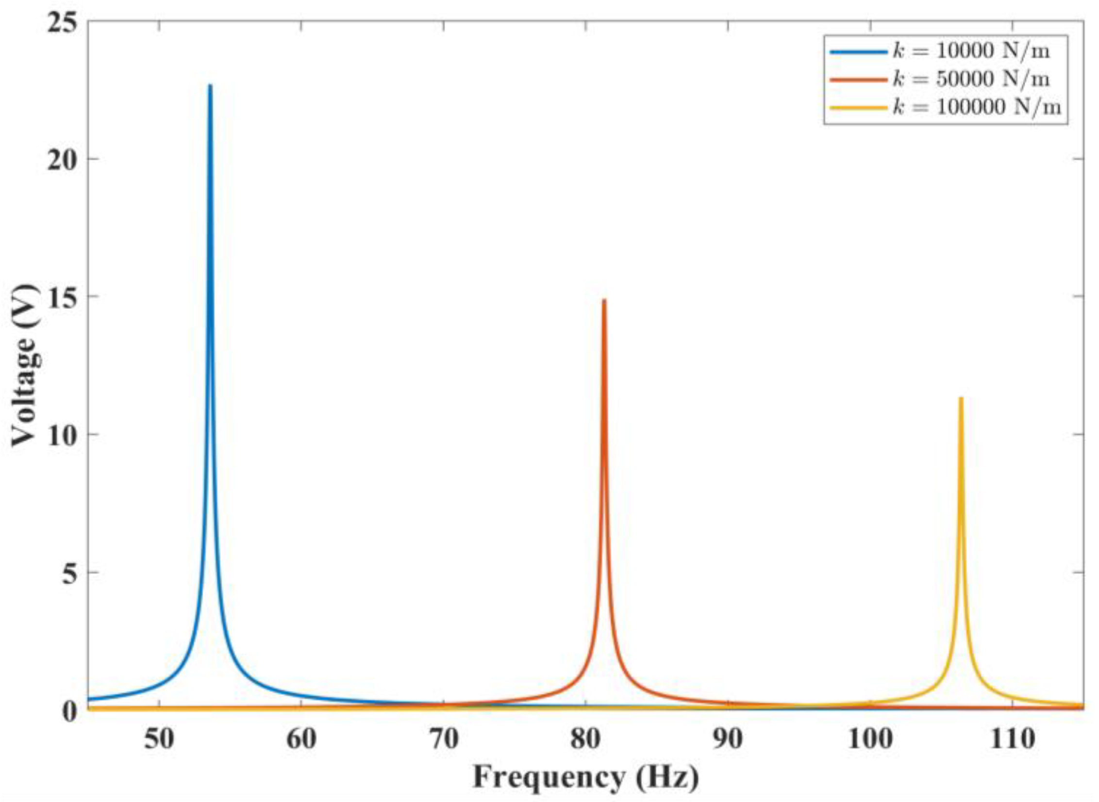 k shifts the frequency corresponding to the maximum voltage output upward, while simultaneously reducing the peak voltage. This behavior is typical in elastic systems, where stiffness modulates both the natural frequency and vibration amplitude. Specifically, the system exhibits a higher peak voltage of 22.69 V at a lower frequency of 53.31 Hz, compared to a lower peak voltage of 11.36 V at a higher frequency of 11.36 Hz. Consequently, in designing vibration energy harvesters or sensors, the spring stiffness