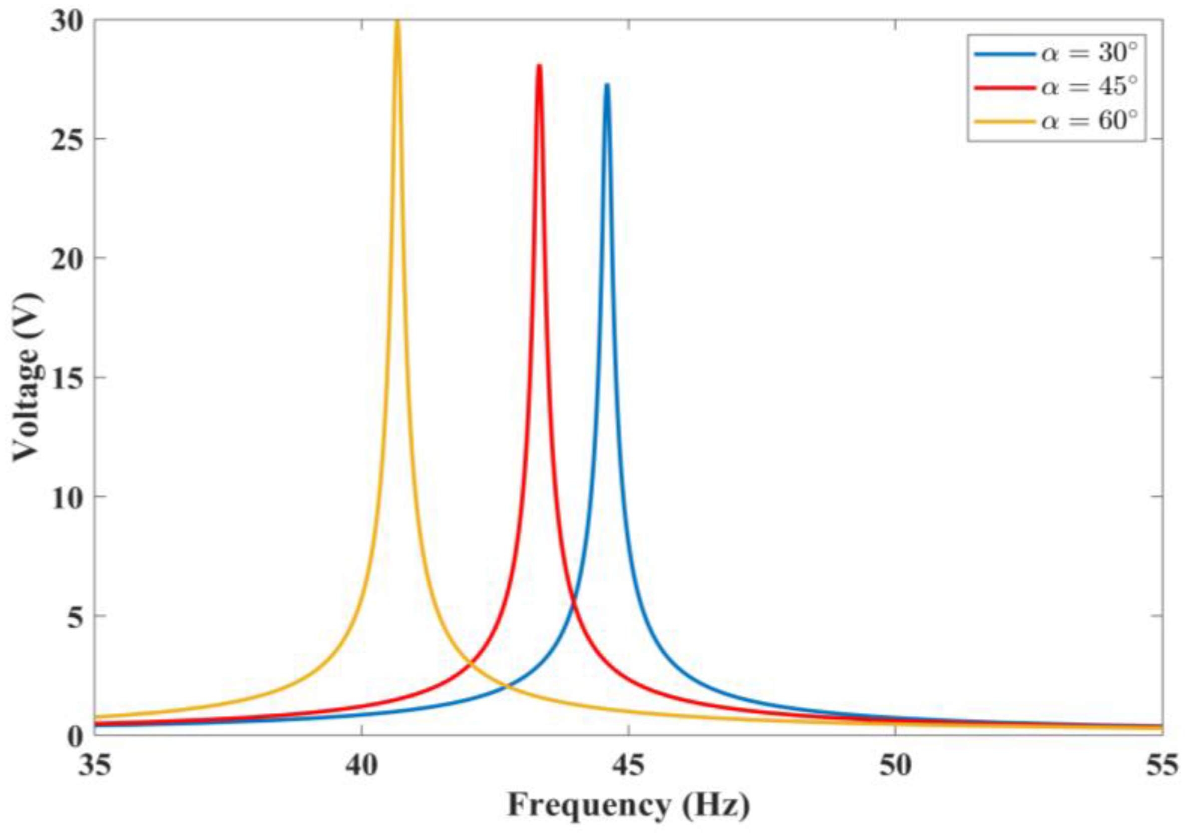 α leads to progressively higher peak voltages, with the maximum output increasing by approximately 25% from the lowest to the highest angle tested. Concurrently, the resonant frequency exhibits a subtle downward shift (from 44.62 Hz at