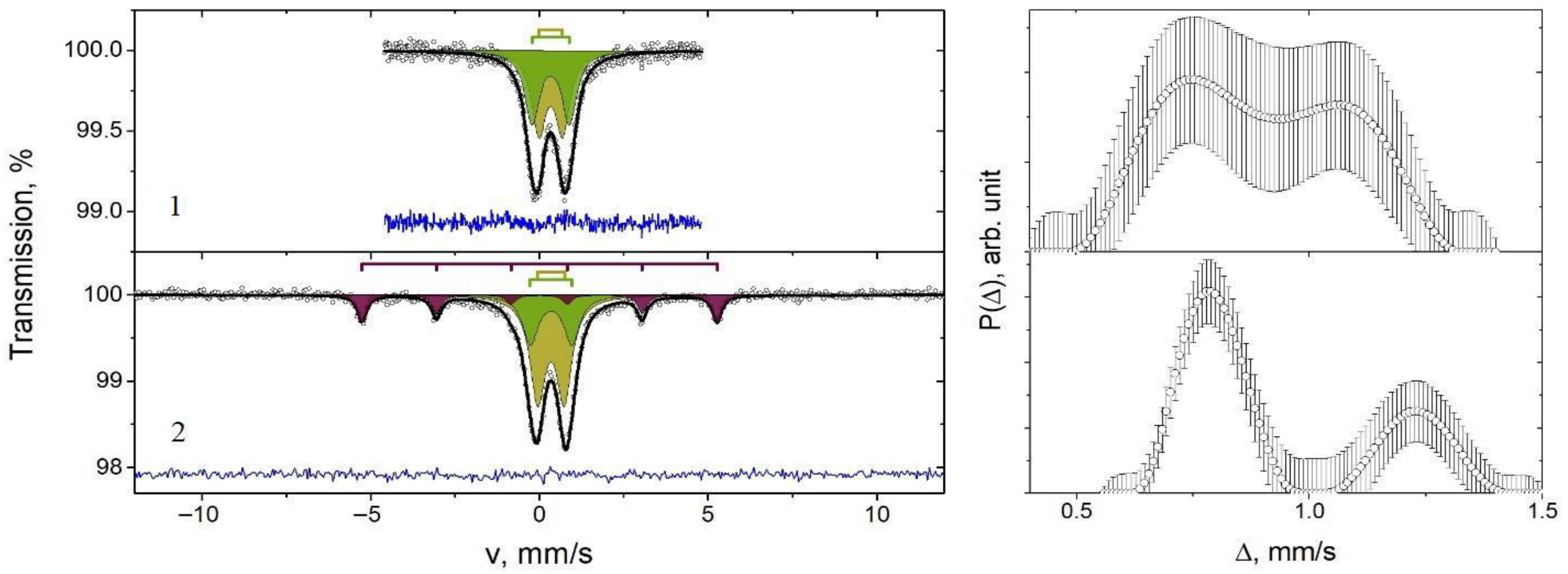 | Sample | Components | δ ± 0.02, mm/s | Δ/ε ± 0.02, mm/s | H ± 1, kOe | γ ± 0.02, mm/s | A ± 1, % |