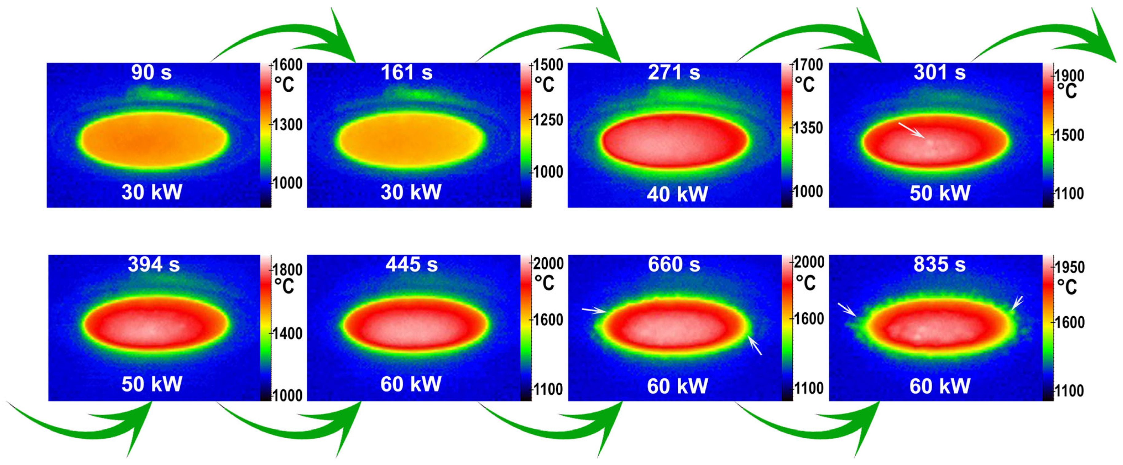 - Marschall, J.; Pejakovic, D.; Fahrenholtz, W.G.; Hilmas, G.E.; Panerai, F.; Chazot, O. Temperature Jump Phenomenon During Plasmatron Testing of ZrB2-SiC Ultrahigh-Temperature Ceramics. J. Thermophys. Heat Transf. 2012, 26, 559–572. [Google Scholar] [CrossRef]