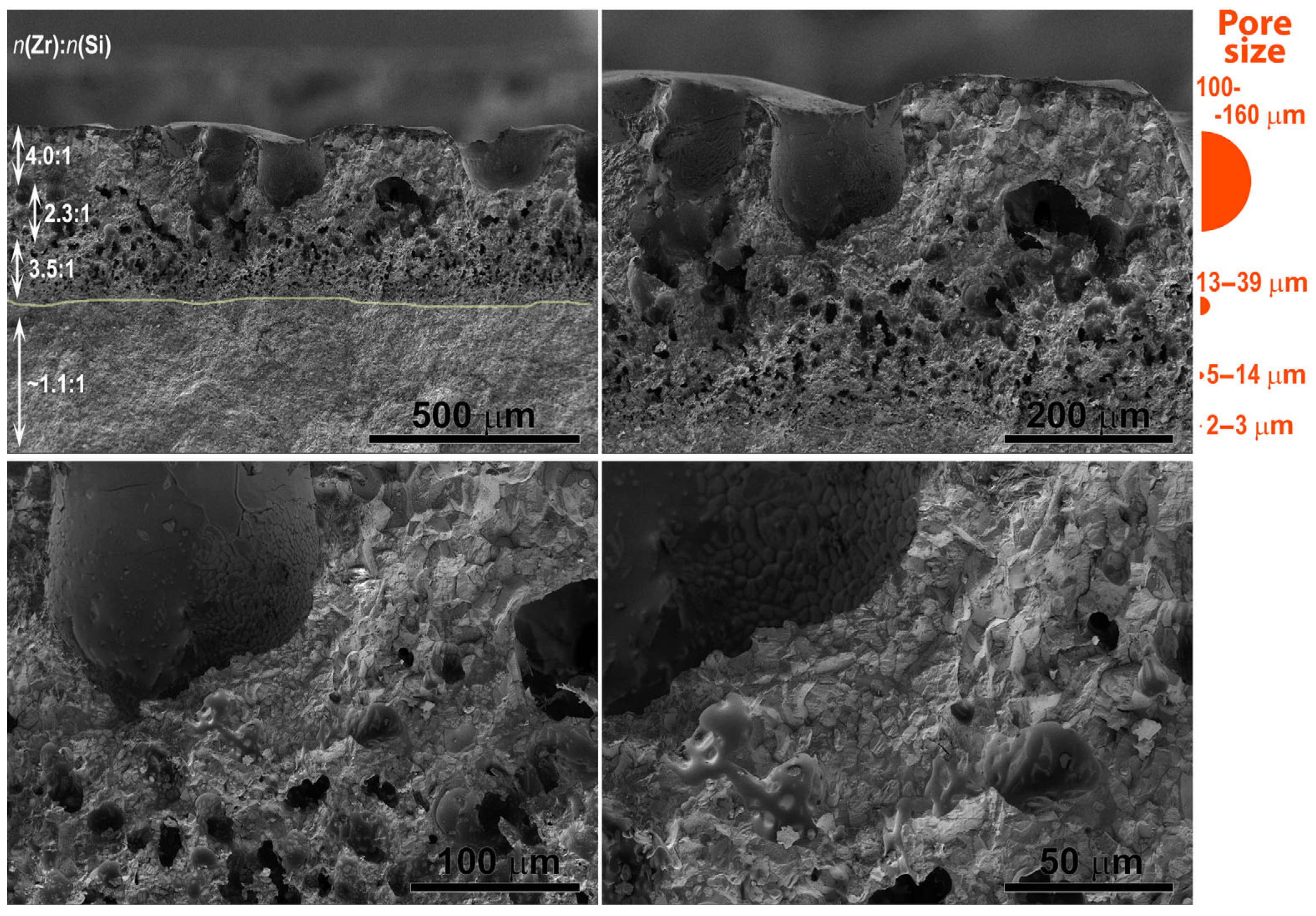 - Li, P.; Ge, Y.; Jin, X.; Lu, P.; Hou, C.; Wang, H.; Fan, X. Cyclic Thermal Shock Behaviors of ZrB2-SiC Laminated Ceramics Sintered with Different-Sized Particles for Each Sublayer. J. Aust. Ceram. Soc. 2023, 59, 645–655. [Google Scholar] [CrossRef]