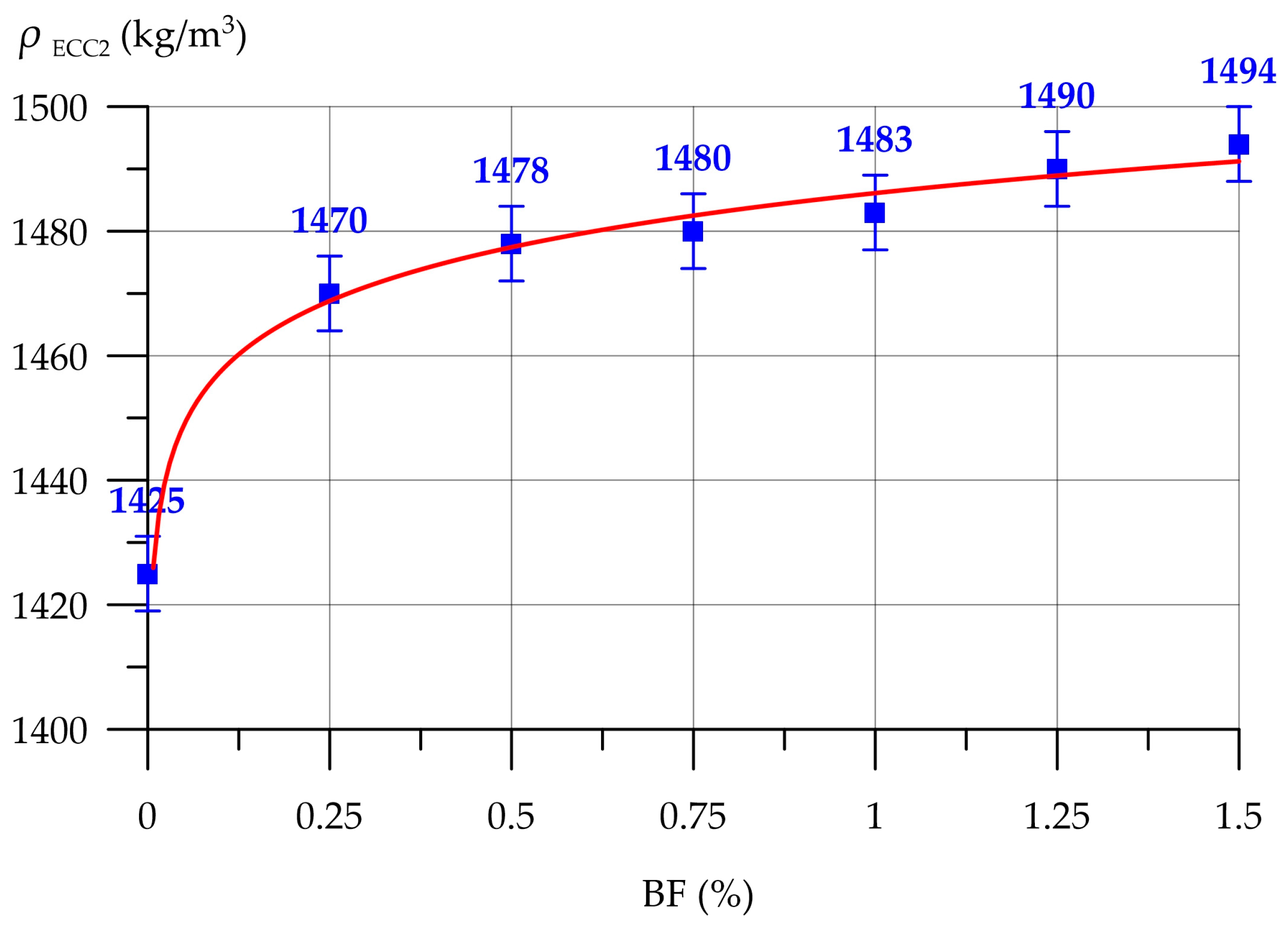 Figure 11 shows that the inclusion of up to 1.5% BF in ECC with CP-LECA10MS does not significantly affect the density of cured ECC. The maximum density of 1494 kg/m