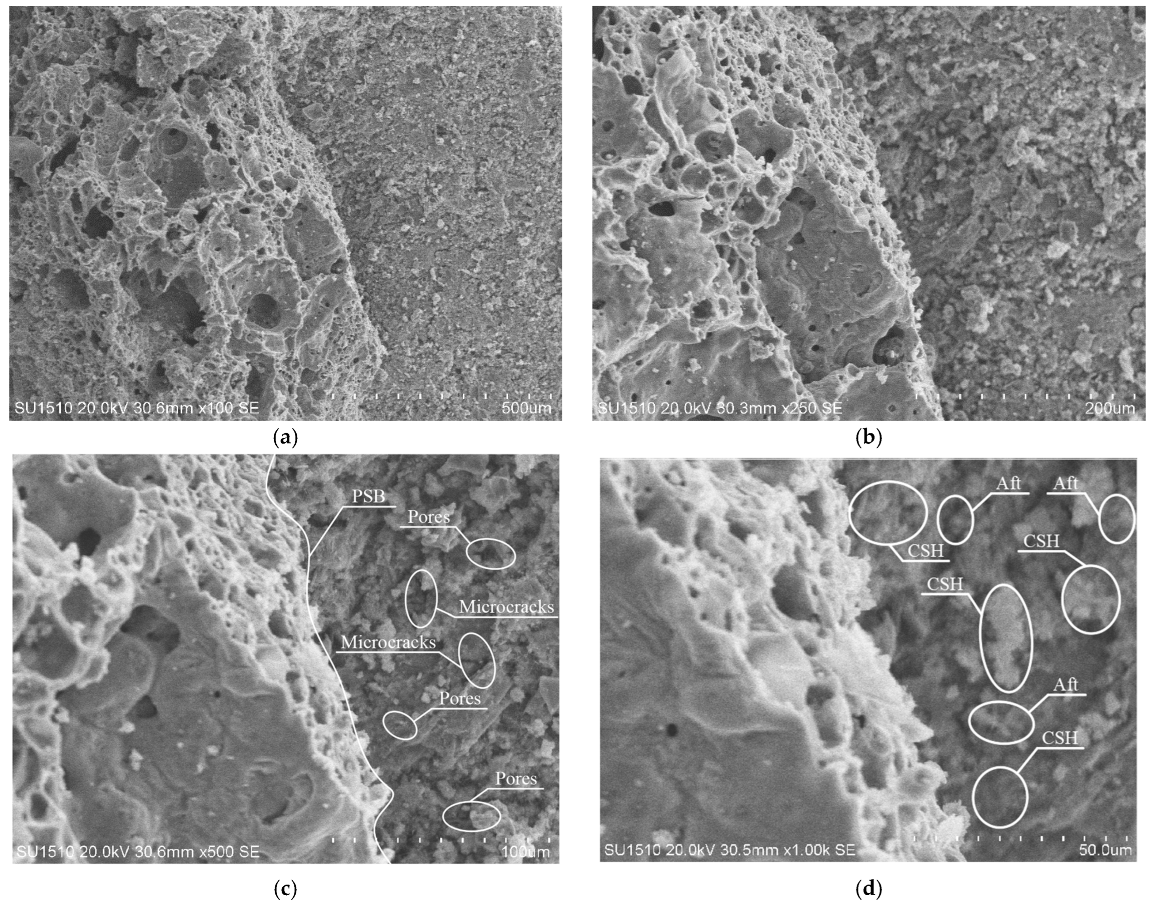 Figure 17d). SEM analysis of the structure of the developed ECC control composition, compositions of the CP-LECA10MS and CP-LECA10MS-0.75BF types is comparable with the obtained values of strength properties. Significant accumulations of cement paste in the porous structure of the filler in the boundary zone of “CP-LECA—cement-sand mortar” contribute to the formation of stronger bonds in the PSB zones, which ensures higher values of compressive and flexural strength of ECC containing treated coarse aggregate [