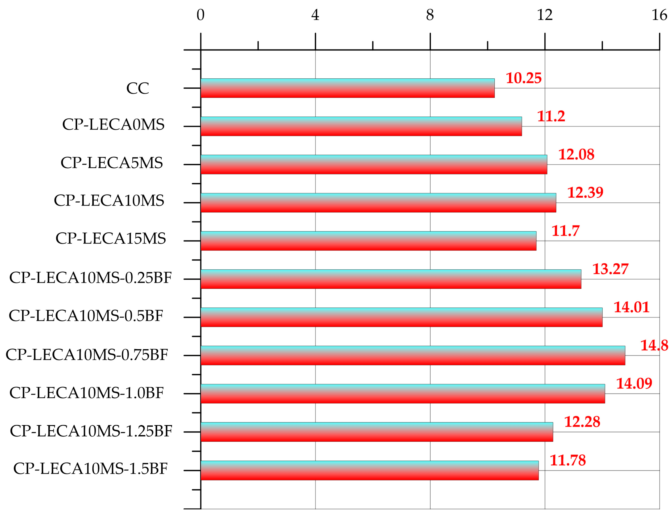 3 was recorded for the CP-LECA10MS-1.50BF composition, which is 4.8% higher than the control composition.