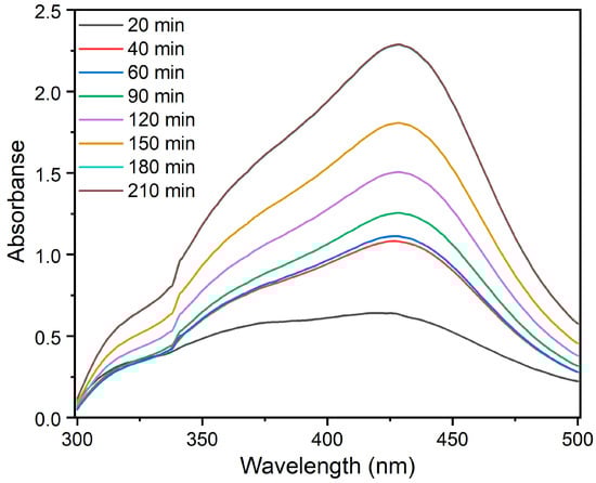 Figure 3 presents the UV-Visible absorption spectra of AgNPs synthesized under the optimized conditions. The spectra exhibit a characteristic, well-defined LSPR absorption maximum at λmax = 428 nm, which is consistent with spherical silver nanoparticles 10–50 nm in diameter. The sharp, narrow linewidth of the LSPR peak indicates a uniform particle size distribution, while the high absorbance intensity reflects excellent nanoparticle synthesis efficiency under the established conditions. The temporal stability of this spectroscopic signature, with no significant changes observed beyond the 180 min synthesis timepoint, confirms the exceptional colloidal stability of the synthesized nanoparticles and the reliability of the optimized synthesis protocol.