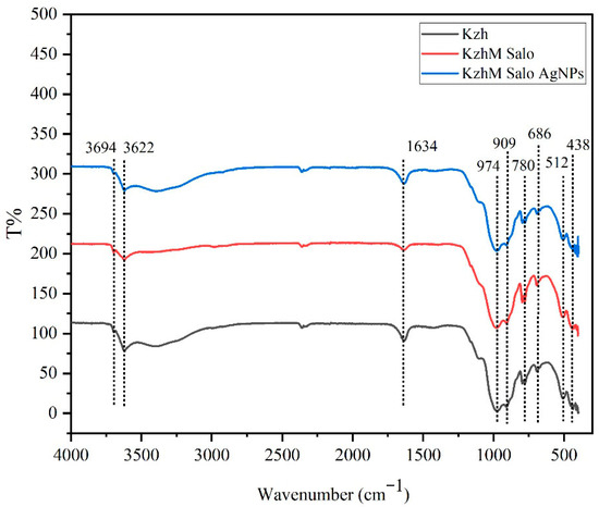 Figure 4 displays the FTIR spectra of Kzh, KzhM Salo, and KzhM Salo AgNPs. The unprocessed sample displays distinct absorption bands of montmorillonite, demonstrating its prevalence in the clay mineral composition. The prominent absorption peaks in the high-frequency region include 3694 cm−1, which corresponds to the stretching vibration of hydroxyl groups within the bentonite structure, and 3622 cm−1, which is associated with the stretching vibration of hydroxyl groups in the water molecules located in the interlayer spaces of bentonite. The continued presence of these bands following purification and AgNPs alteration signifies the structural stability of the clay layers [19]. The main changes caused by modification are manifested in the first region, which is associated with the evaporation of physically adsorbed water from the clay surface, dehydroxylation of clay, and decomposition of organic impurities. Thus, smoothing of the peaks in the frequency region of 3622 cm−1 can be seen. The absorption band at 1634 cm−1 corresponds to the bending vibration of adsorbed molecular water within the interlayer region, indicating the hydrophilic characteristics of bentonite [20]. The relative intensity of this band diminishes somewhat in the AgNPs-modified sample, indicating a partial substitution of interlayer water molecules by AgNPs, a phenomenon already noted in analogous clay-nanoparticle systems [21]. In the fingerprint region, multiple diagnostic absorption bands are detected, affirming the montmorillonite-rich composition of the bentonite samples. The band at 974 cm−1 corresponds to the stretching vibration of the Si–O–Si framework within the tetrahedral sheet, in agreement with prior studies on smectitic clays [22]. The faint shoulder at 912 cm−1 is associated with Al–Al–OH bending vibrations in the octahedral sheet, signifying the existence of dioctahedral montmorillonite. The supplementary band at 796 cm−1 is ascribed to Fe3+–OH–Mg vibrations, indicating a partial substitution of Al3+ by Fe3+ and Mg2+ in the octahedral sites, a typical characteristic of natural bentonites. The peaks at 686 cm−1 are attributed to Si–O–Al bending modes, whilst those at 512 and 438 cm−1 are associated with Si–O–Si and Al–O–Si deformation vibrations, respectively [23].