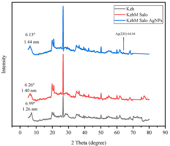 Figure 5 displays the XRD patterns of Kzh, KzhM Salo, and KzhM Salo AgNPs. The unaltered bentonite displayed a basal reflection at 2θ = 6.99°, indicating a basal spacing (d001) of 1.26 nm, typical of montmorillonite, the predominant smectitic phase in bentonite. Following purification via the Salo method, this reflection transitioned to 6.26° (d001 = 1.40 nm). The noted shift is mostly ascribed to the enhancement of the clay fraction subsequent to the extraction of soluble salts and carbonates. This treatment improves the hydration and interlayer cation exchange capacity of montmorillonite, thereby increasing the basal spacing, consistent with prior studies on purified smectitic clays [24]. After functionalization of AgNPs, the basal reflection shifted to 6.13° (d001 = 1.44 nm), which indicates a slight increase in the interlayer distance, but sufficient for effective integration of Ag into the clay matrix. The expansion is due to the intercalation of AgNPs into the interlayer of montmorillonite. Similar changes in basal reflections have been documented in the literature. Abdelkrim et al. noted an increase in the d001 distance from 1.26 to 1.47 nm after AgNP functionalization, attributing this change to the interlayer placement of AgNPs [25]. As can be seen, the final value of the interlayer distance noted in this study is close (of the same order of magnitude) to the values recorded for high-performance Ag-montmorillonite composites used for biomedical and antibacterial purposes. This convincingly confirms the effective integration of Ag into the clay matrix and means that the observed structural changes not only agree with previous studies but also emphasize the suitability of the present synthesis method for medical applications. Thus, the ion-exchange properties of montmorillonite are successfully used in medical practice in the creation of composite materials used as fillings in dentistry. In addition to the basal reflections, a unique peak at 2θ = 64.04° was detected in the Ag-functionalized sample, corresponding to the (220) plane of face-centered cubic silver (JCPDS card no. 04-0783). This reflection indicates the effective deposition of crystalline AgNPs on the bentonite matrix. Comparable findings for Ag(111), Ag(200), Ag(220), and Ag(311) reflections have been documented in Ag-montmorillonite composites, corroborating the simultaneous presence of intercalated and surface-deposited Ag nanoparticles [26]. It is important to highlight that certain overlapping reflections within the range of 20–27° could be attributed to quartz, a frequent impurity found in natural bentonites. The enduring presence of these peaks, even after purification, has been documented in prior studies and does not impede the structural modification of the clay [27]. It should be noted that another associated mineral in the composition of bentonite clay is kaolinite. Diffractogram for kaolinite shows that the diffraction angle 2θ = 12.30 with interplanar distance d = 0.71 nm. In the composition of the initial sample, along with montmorillonite, lines characteristic of quartz, mica, and mixed-layer clay minerals were detected. Mica is detected as an impurity [28].