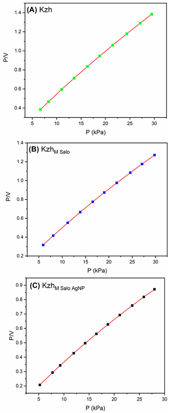 Line graphical representation of the BET adsorption isotherm of the (A) Kzh, (B) KzhM Salo, and (C) KzhM Salo AgNPs.