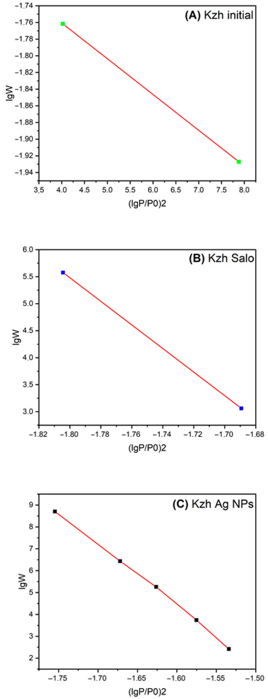 Adsorption isotherm in coordinates of the Dubinin–Radushkevich equation: (A) Kzh, (B) KzhM Salo, and (C) KzhM Salo AgNPs.