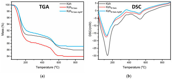 (a) TGA and DSC curves of Kzh, KzhM Salo, and (b) KzhM Salo AgNPs.