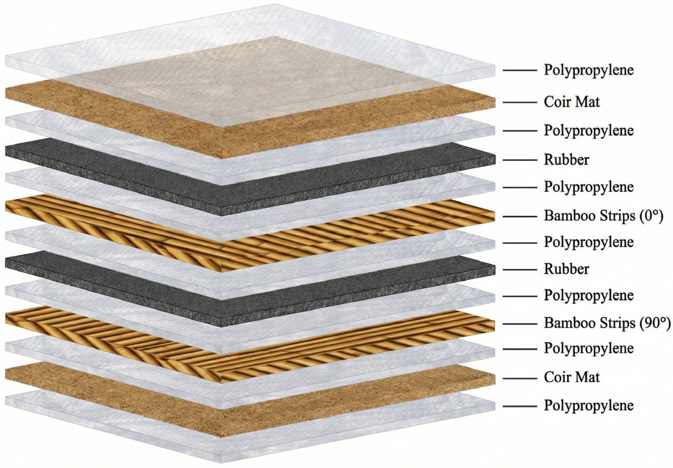 - The combination of bamboo and coir fibers with a PP matrix and SBR modification yields a fully thermoplastic laminate exhibiting toughness levels comparable to structural plywood.