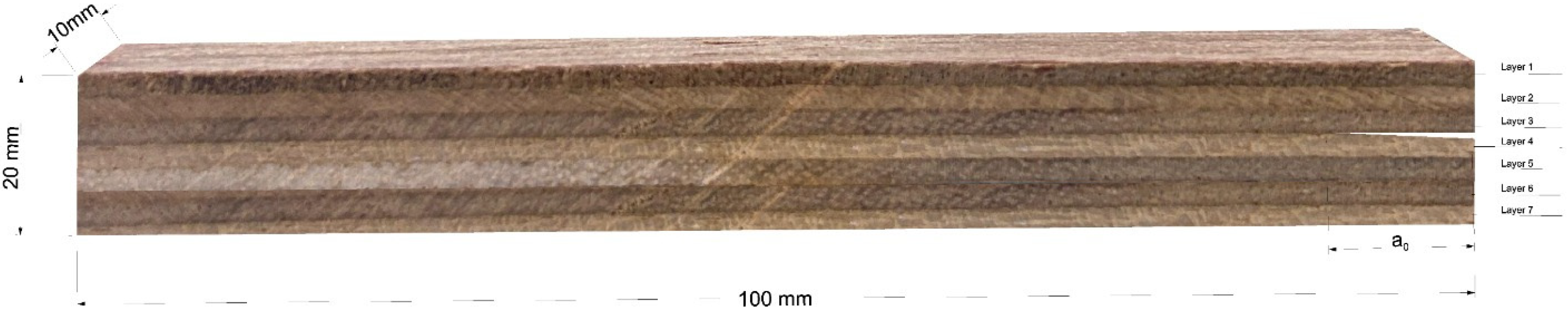 - Hadiji, H.; Serra, J.; Curti, R.; Gebrehiwot, D.; Castanié, B. Characterization of mode II delamination behaviour of poplar plywood and LVL. Theor. Appl. Fract. Mech. 2024, 131, 104354. [Google Scholar] [CrossRef]