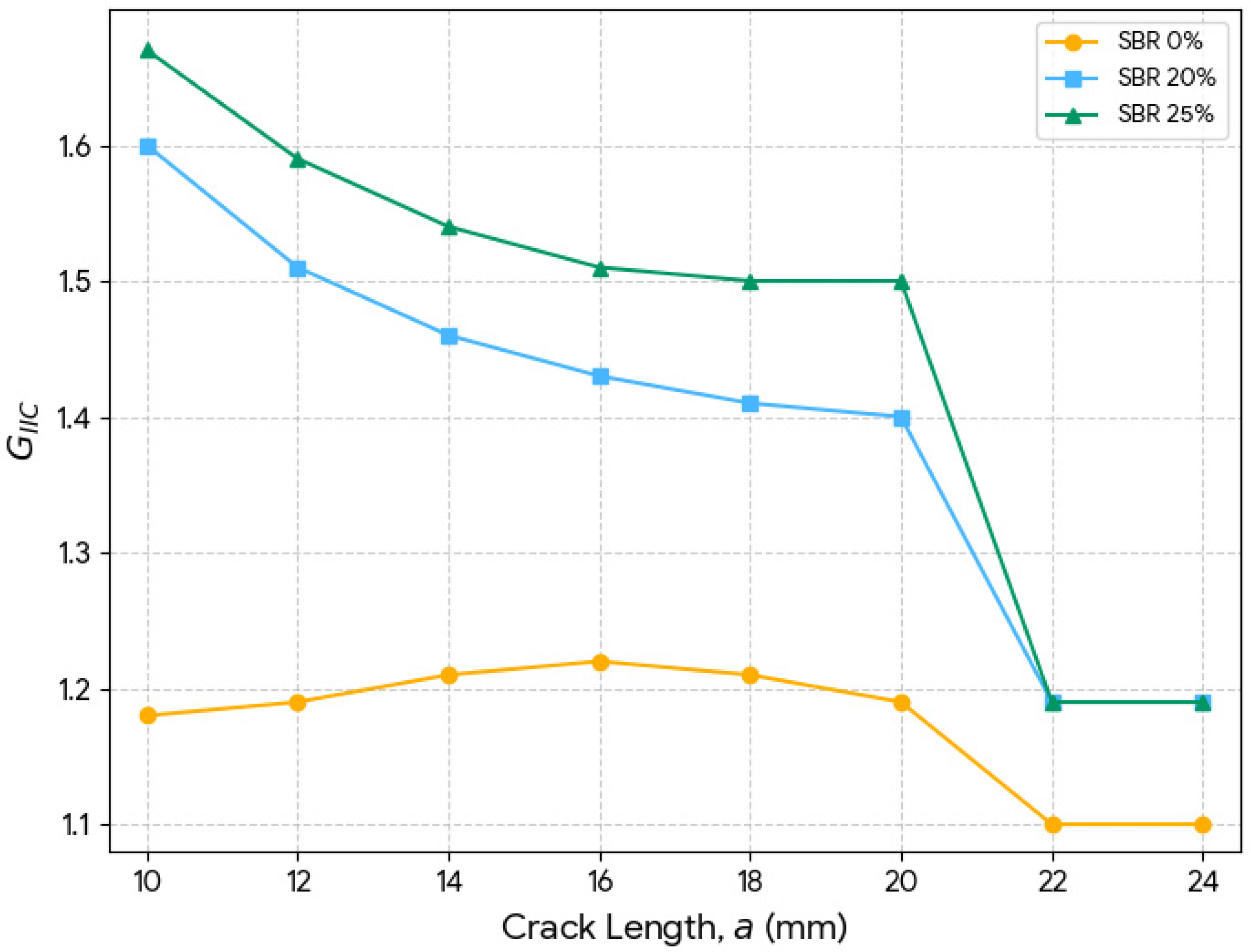 - The Mode II strain energy release rate of BCR panels increased considerably with the incorporation of SBR, achieving up to 1.98 kJ/m2 at 30% SBR content as compared to 1.26 kJ/m2 for the unmodified laminate (SBR 0%). This improvement was attributed to rubber-particle cavitation, matrix shear yielding, and coir–fiber bridging mechanisms that together promote progressive crack growth and delayed delamination. Optimal enhancement occurred at 20–25% SBR, balancing the ductility and stiffness while maintaining nearly 90% of the unmodified load-bearing capacity.