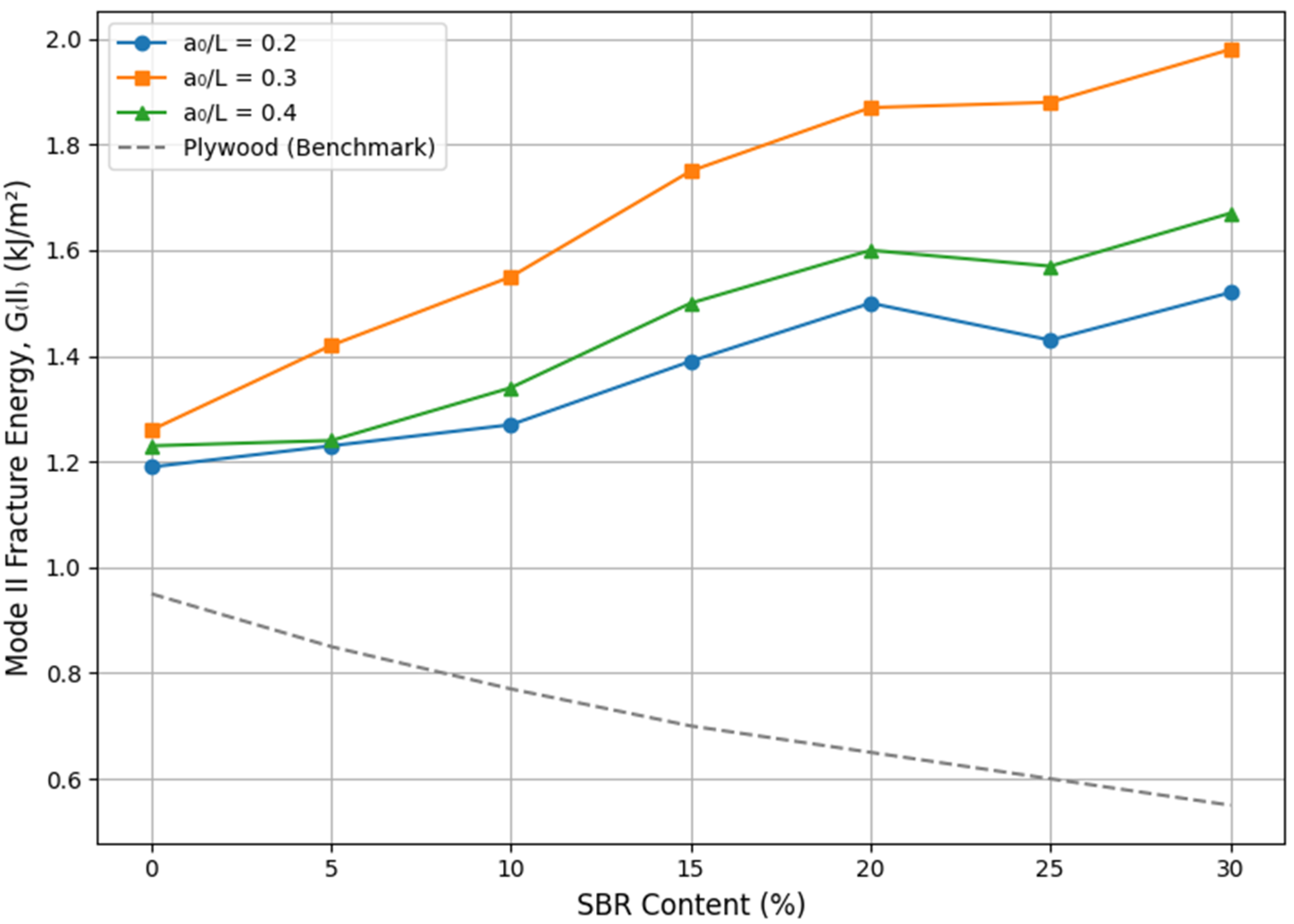 - The commercial plywood exhibited brittle, unstable fracture with GII in the range of 0.7 to 0.9 kJ/m2. The inclusion of SBR resulted in 60–80% higher Mode II fracture energy, emphasizing superior energy absorption and damage tolerance of the hybrid laminates over traditional resin-bonded veneers.