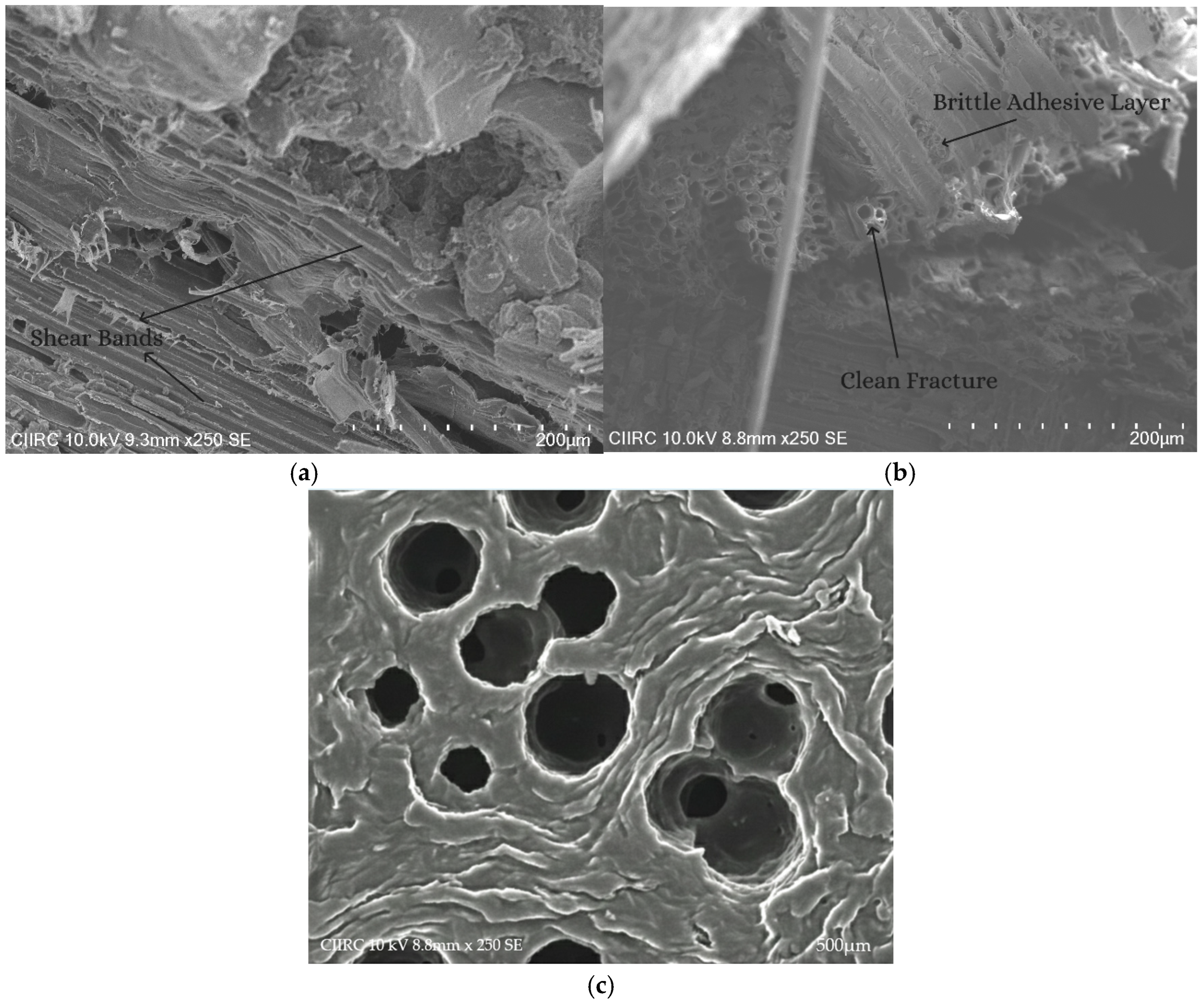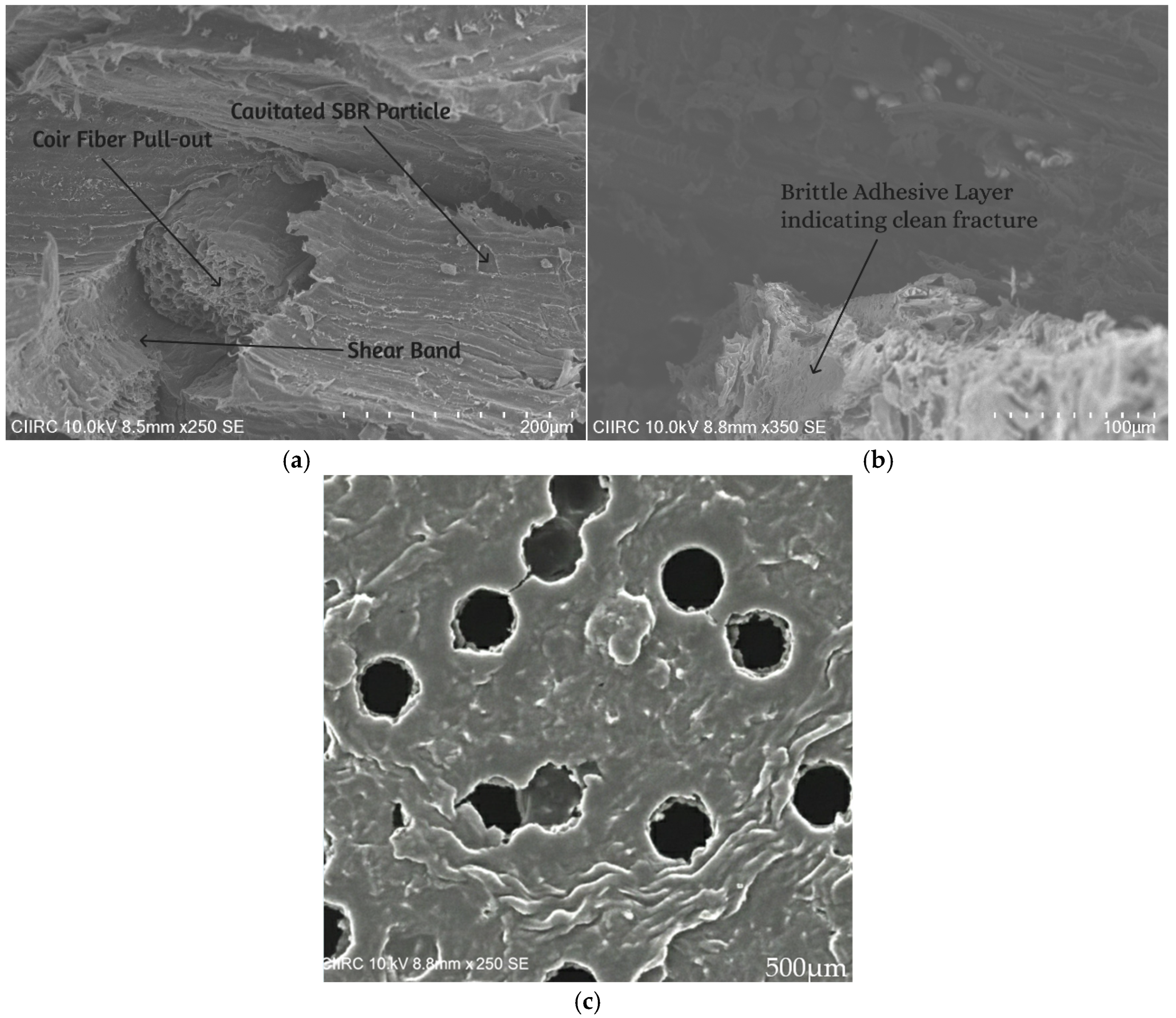- SEM analysis confirmed the presence of cavitated SBR domains, plastic shear bands, and coir-pullout zones, validating the observed macroscopic increase in the fracture energy. The ductile failure morphology contrasted with the clean brittle adhesive separation seen in plywood. This underscored the constructive interaction between rubber-induced plasticity and natural fiber bridging.