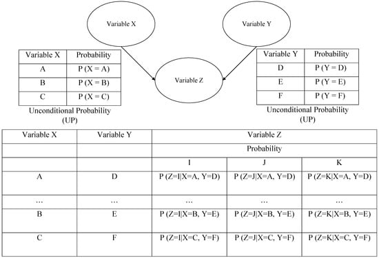 In BNs, the relationships between the variables are described by nodes and links. For example, a variable is the parent of another variable (and vice versa) if a link exists between them. These dependencies are quantified using conditional probability tables (Figure 1). Based on BNs, the Bayes theorem provides a convincing approach to managing uncertainty by openly displaying the conditional probability connections between parameters []. In the BNs approach, for number of parameters with , and a given observation , the probability is calculated as follows: