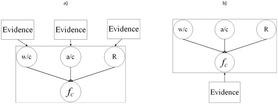 - Updating: Once the architecture of the BN and the CPTs were defined in the BN, prior distributions and evidence could be introduced in the BN for prediction purposes. Two case studies with specific objectives were defined. Figure 2 depicts the considered case studies. The first objective is to predict by updating the parent nodes with the characteristics of a given formulation. The second objective is to determine some parameters of the RAC formulation by updating a target compressive strength.