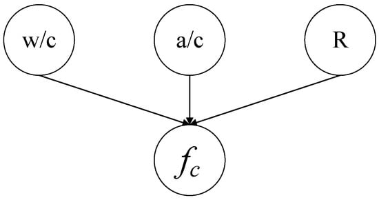 Many real-world applications have adopted Bayesian networks because this methodology could be used to estimate specific variables, handle uncertainties, and integrate observations (evidence) to facilitate decision analysis and provide prompt responses to end users [,]. The probabilistic inference of BNs requires information about the prior probability distribution, the influence of variables, and the reasoning from cause to effect and from effect to cause []. Once the BN is developed, it can be updated anytime, whenever new data become available [,]. Furthermore, the BN method works with small datasets and allows for backward prediction, which is useful for the formulation problem when the target compressive strength ( is known. As mentioned above, artificial-intelligence approaches have been widely applied to predict the hardened properties of RAC. However, the potential of BNs, especially Bayesian updating, has not been comprehensively exploited to predict the hardened properties or the formulation of RAC.