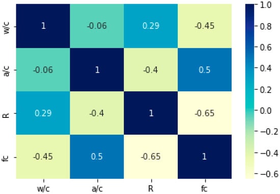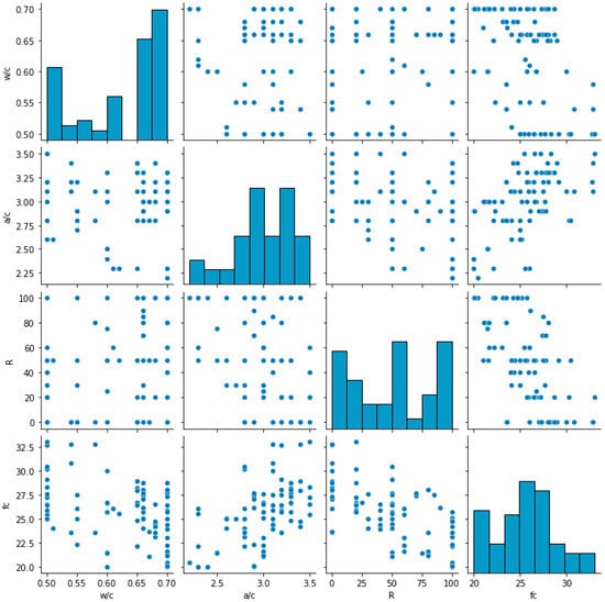 Figure 4 displays the scatterplot of the database. About 24% of values are primarily concentrated in the range of 0.6 to 0.65. For the aggregate-to-cement ratio (, 64% of values are concentrated in the range 3 to 3.5. For , 53% of values are found in the range of 25–30 MPa. For , 33% and 30% of values are far away from the mean and concentrated in the ranges 0–25 and 75–100, respectively. This is mainly due to the fact that in the literature, many studies take as a reference concrete without CRA (%) or with a complete replacement ratio (%).