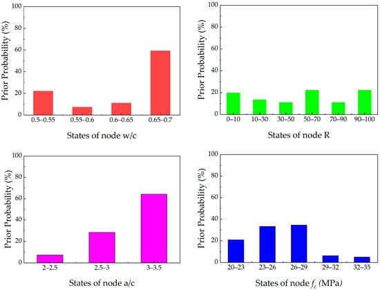 The prior probabilities were calculated from the frequencies of the database. The prior distributions for the parent and the child nodes are depicted in Figure 6. In Figure 6, the prior values are focused on the states 0.5–0.55 and 0.65–0.7; these are 22.2% and 59.3%, respectively. Regarding , the values in the prior probability focus on 64.2% at state 3–3.5. The values in the distribution emphasize the same probability of 22.2% at states 50–70 and 90–100, respectively. The values of concentrate on states 20–23 MPa, 23–26 MPa, and 26–29 MPa, with prior probabilities of 20.9%, 33.3%, and 34.5%, respectively. However, the distribution of is uniform, indicating that the discretization of the database has approximatively a uniform representation of this parameter that is quite important when we try to predict the performance of RAC. The concentration of data in the first three states for could result in more accurate predictions when targeting a between 20 and 29 MPa.
