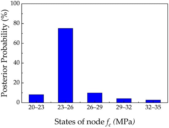 where . A Python library was used to implement this BN architecture and determine the posterior probability of by Bayesian inference. Considering the prior probabilities presented in the previous section, the probabilities of the child node are depicted in Figure 7. The results show that in the state 23–26 MPa is the highest probability of , which is equal to 75.1%. The probabilities rise compared to prior values for states 23–26 by 41.8%, whereas the posterior probability of states 20–23 MPa and 26–29 MPa decrease by 12.75% and 24.6%, respectively. For the state 29–32 MPa, the posterior probability is 2.71%, which is low compared to the prior probability of 4.9%. In summary, these results illustrate how the prior information could be used to estimate the distribution of a variable of interest, which is, in this case, . Further applications of the proposed BN framework are provided and discussed in the next section.
