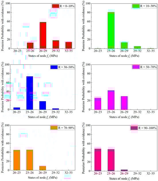 Figure 8 shows the posterior probabilities of the studied cases. With small replacement ratios ( = [0–10%], reference case), the posterior probability values of are 58.5% and 18.2% for the states [26–29 MPa] and [29–32 MPa], respectively. The larger probability for these states indicates that value for this reference concrete is reasonable in comparison with the results for the other cases because the reference concrete always has the highest strength compared to RAC with the same/close . Furthermore, the reference concrete has no recycled aggregate, which is the main reason for the reduction of because of the large water absorption of CRA, which increases the total water quantity and reduces the compressive strength []. When increases, there is a reduction in the compressive strength, which is consistent with the literature [] and our experimental observations (Appendix B). When = 100%, larger probabilities are observed at the states [20–23 MPa] and [23–26 MPa], which correspond to the lower values of . The compressive strength decreases for large values by two reasons: (i) using large amounts of CRA with high absorption will lead to weak the bond between the RA and the cement matrix, reducing the concrete strength; and (ii) using large amounts of CRA decreases the shear strength of the aggregate matrix because the CRA has a smaller crushing value than the natural aggregate [].