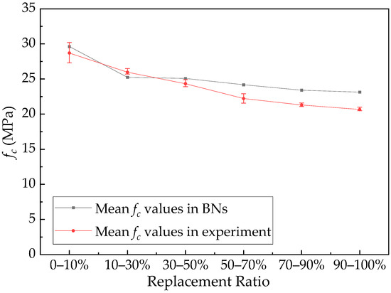 The means for estimated from Bayesian inference and experimental data are depicted in Figure 9. with = 0% is 29.6 MPa, and the corresponding relative error is 3%. With = 20%, the value of decreases to 25.2 MPa, and the relative is 2.7%. These are small, indicating that, for these replacement rates, the predictions have a very good agreement with the experimental data. increases by 3.1%, 8.1%, 8.9% and 10.5% for = 40%, 60%, 80% and 100%, respectively. The relative errors of values predicted with BNs are low when % and around 10% for high replacement ratios. These small errors demonstrate that the BNs approach outperforms other models, like bagging regressor, decision tree, and gradient boosting, that are employed in the literature with the same dataset []. When 10–30%, the value of the BNs is smaller than the experimental value, which is different from the trend of the previous cases. The reason here may be the lack of data in this case. Furthermore, the error of the BNs increases significantly when considering large replacement ratios. This can be explained by the lack of experimental data or may be due to the nature of the CRA used in our experiments (included recycled concrete, recycled brick, etc.) being different from the CRA used in the studies from the literature (only recycle concrete). These results could be enhanced by filtering the information used to create the BN configuration and optimizing the discretization of the nodes in the BN []. Furthermore, the model can include other parent nodes, such as the cement content, the composition of CRA, etc., to reduce the relative errors. This requires more complete datasets.
