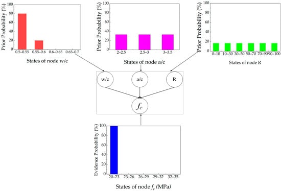 In this section, we will fix a target and use the distribution of this target to estimate, by Bayesian updating, the required distributions of the parent nodes. More specifically, the new information will update the BN with a histogram where the target is to obtain a given resistance. Figure 10 shows the configuration of the BN, the prior distributions of the parent nodes, and the evidence of the child node. In this case, we assume that the prior probabilities of parent nodes are: : 80% for [0.5–0.55] and 20% for [0.55–0.6]; and for and the prior probabilities have the same values for all the states. This means that we are looking for a formulation with low and we do not make any assumption about the values for and . We suppose that after that, the target probability value (evidence) for the compressive strength has a probability of 100% belonging to the state [23–26 MPa]. This corresponds to a mean value of 21.5 MPa.