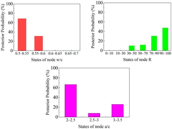 Figure 11 presents the posterior probabilities of , , and after updating the node. In comparison with Figure 10, the posterior probabilities of , and changed with the evidence. The probability values of have a maximum value of 68.7% for states [0.5–0.55], which is low compared to the prior probability of 80%. The values of the node changed to a maximum value of 66.4% at state [2–2.5], which is a high value compared to the prior value of 33.3%. The posterior probabilities of are large for the states [70–90%] and [90–100%]; these results are 30.53% and 47.51%, which are high compared to 16.7% and 16.7% of prior values, respectively. These values could provide some insights into the concrete formulation (, and ) required to obtain a target compressive strength. For example, the mean values of parent nodes in this example are 0.54, 2.54, and 80.7% for , and , respectively. Furthermore, the results could be improved by filtering the data used to build the CPT as well as optimizing the discretization of the nodes in the BNs, as mentioned previously. Further work should be addressed in both areas.