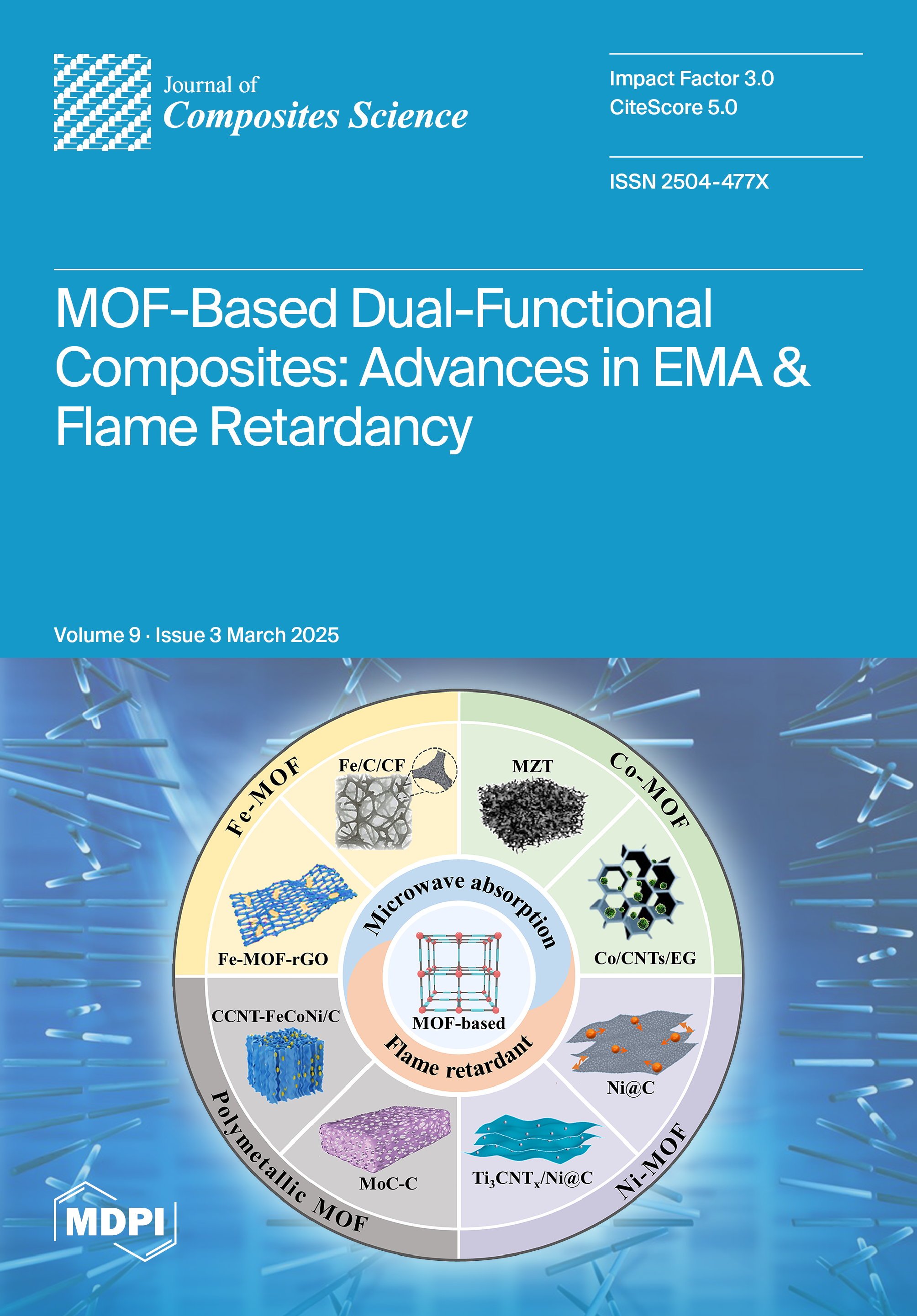 Cover Story: Metal–organic frameworks (MOFs) are emerging as promising candidates in the development of multifunctional materials that combine electromagnetic microwave absorption (EMA) and flame retardancy. This review summarizes recent advances in MOF-based dual-functional composites, focusing on Fe-MOF, Co-MOF, Ni-MOF, and polymetallic MOF systems. These materials demonstrate exceptional EMA performance, with RL values reaching −75 dB and EAB values up to 7 GHz, while achieving UL-94 V-0 ratings and LOI values exceeding 30%. The challenges and future prospects of MOF-based dual-functional composites are also discussed, providing valuable insights for designing next-generation multifunctional materials to address electromagnetic pollution and fire safety concerns. View this paper
