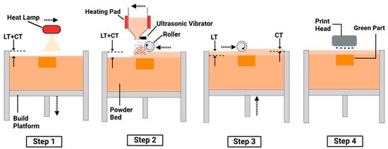 Four steps in binder jetting using powder bed compaction (layer thickness is represented by LT, and compaction thickness is represented by CT) [22].