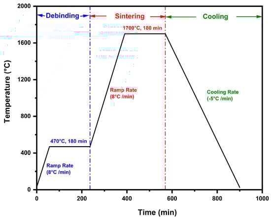 The debinding and sintering of printed SiC preforms were conducted using a box furnace (KSL-1750X-KA3, MTI Corporation, Richmond, CA, USA). The debinding and sintering cycles for the SiC preforms are shown in Figure 2. The furnace temperature was initially increased from room temperature (20 °C) to 470 °C at a rate of 8 °C per minute [26]. The temperature was then held at 470 °C for 180 min to ensure complete binder removal. After debinding, the furnace temperature was ramped up to 1700 °C at the rate of 8 °C per minute. The furnace temperature was maintained at 1700 °C for 180 min to sinter the preforms. Upon completion of sintering, the furnace was cooled to room temperature at a rate of ~5 °C per minute.