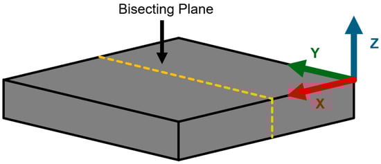 To prepare the sample for cross-sectional imaging, the infiltrated SiC preform was bisected along the Y-Z plane (as shown in Figure 3) where the Z-axis is the print direction (thickness), the X-axis is the powder spread direction, and the Y-axis is perpendicular to the X-Z plane. The SiC preform was buried in the Al+Mg mixed powder during infiltration. It was expected that the infiltration took place in all directions. Cross-sectional images of the infiltrated SiC preform were captured using an iPhone 15 Pro Max.