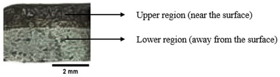 Figure 4 shows the cross-sectional image of the infiltrated preform. It shows that the surface looks darker in the upper region of the cross-section of the infiltrated preform, implying that infiltration occurred in this region. This speculation is substantiated by the SEM images of the cross-section.