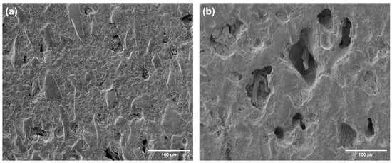 The SEM images in Figure 5 show the microstructure of infiltrated SiC preform. These SEM images were taken in the upper region and lower region of the cross-sectional surface of the infiltrated preform shown in Figure 4. The SEM image taken in the upper region, shown in Figure 5a, has mostly filled pores with only a few remaining voids, confirming successful aluminum infiltration. The SEM image taken in the lower region, shown in Figure 5b, contains large, irregularly shaped pores, suggesting incomplete aluminum infiltration.
