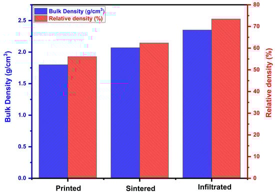 Figure 6 shows the bulk density and relative density of printed SiC preform, sintered SiC preform, and infiltrated SiC preform. The green density (about 1.8 g/cm3) and relative density (56.07%) of the printed preform were lower than those of the sintered preform and the infiltrated preform. This is due to the high porosity and the presence of binder materials. The relative density of the printed preform was calculated without considering the binder content in the printed preform. When measuring the bulk density of the printed preform, the weight of the printed preform included the weight of the binder inside the preform. This method is widely used in the literature when measuring the density of green parts printed by binder jetting [30,34]. After debinding, the bulk density increases to about 2.07 g/cm3, with a relative density of 62.31%. This increase happens because the binder is removed, and the sintering process partially densifies the SiC preform by reducing open porosity. Following aluminum infiltration at 1000 °C, the bulk density rises further to approximately 2.36 g/cm3, with a relative density of 73.44%.