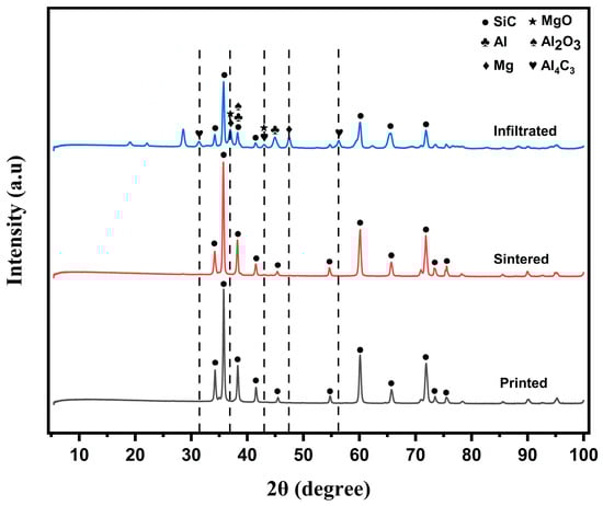 Figure 7 shows X-ray diffraction (XRD) patterns of printed preform, sintered preform, and infiltrated preform. The printed preform displays peaks corresponding solely to SiC, indicating the presence of the base material with no additional phases. After sintering, the XRD pattern remains dominated by SiC peaks, suggesting that sintering does not introduce any significant phase changes. After aluminum infiltration, additional peaks associated with aluminum and magnesium appear prominently in the XRD pattern. The aluminum peaks were particularly evident at 2θ values of around 38.19° and 44.82°. A peak observed at 2θ value of 38.19° aligns closely with the reference peak for Al2O3 (at 2θ value of 37.80° [33]). Peaks at 2θ values of 31.34°, 42.89°, and 56.21° confirm the presence of Al4C3. Peaks observed at 2θ values of 36.8° and 47.44° confirm the presence of Mg, while peaks at 36.8° and 42.89° confirm the presence of MgO. For easy observations, dotted vertical lines are added at 2θ values of 31.34°, 36.8°, 42.89°, 47.44°, and 56.21°.