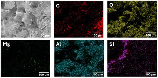 Figure 8 shows the elemental mapping of the infiltrated SiC preform in the upper region of the cross-section shown in Figure 5. The mapping highlights the distribution of key elements: carbon (C), oxygen (O), magnesium (Mg), aluminum (Al), and silicon (Si). Aluminum is present in the upper region of the infiltrated preform. Carbon and silicon are prominently distributed, representing the SiC matrix. Oxygen is observed in small amounts, likely due to minor surface oxidation during processing. A small amount of magnesium was detected because the infiltration process used a powder mixture consisting of 92% aluminum and 8% magnesium by weight. The elemental mapping demonstrates successful aluminum penetration in the upper region of the sintered SiC preform.