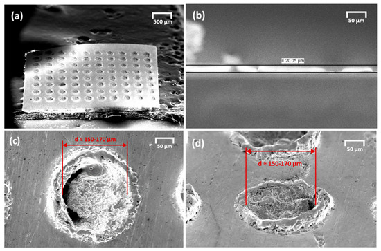As can be seen, the surface has a periodic structure with recesses in the form of holes. These holes are caused by exposure to laser radiation and have a heterogeneous morphology. The polymer layer thickness estimated from SEM images is about 20 μm for PNIPAM/FeRh (Figure 2c).