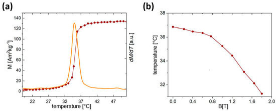 There are different approaches to thermally activate thermoresponsive polymers from conventional heaters to magnetic fields [13,14,15]. This depends on the future practical outcomes and limitations of how a heater should be attached. Approaches based on the use of magnetic fields propose the use of various thermal effects, such as hyperthermia, the magnetocaloric effect (MCE), etc. [16,17]. The advantage of using magnetic fields is the ability to non-contactly control the polymer’s temperature by creating a composite based on a magnetic material and a thermosensitive polymer. For example, by Shen B. [18] was proposed a theranostic model for drug delivery based on magnetic nanoparticles of magnetite, drug model 5-fluorouracil, and PNIPAM polymers. It has been shown that magnetite can be used in this model for both classical magnetic hyperthermia and drug delivery, which is controlled by changing the temperature of the PNIPAM. Another more interesting approach is to use the MCE to control the temperature of a polymer, which can then be used to release a drug [15,19].