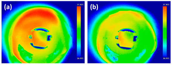 IR images obtained from MCE studies in PNIPAM/FeRh samples using a COX CG-640 IR camera at (a) zero and (b) 1.45 T applied magnetic field.